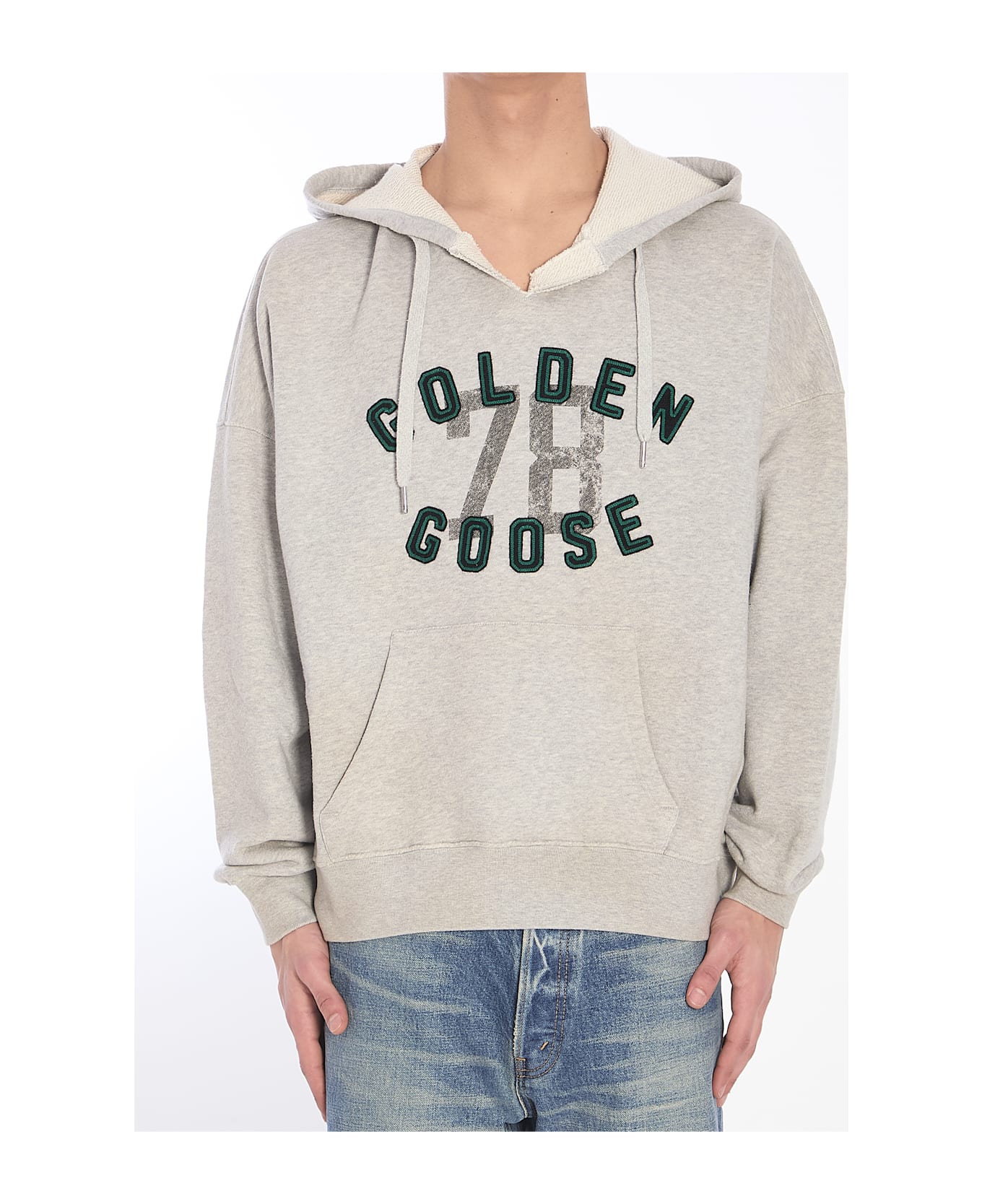 Hoodie in lived-in effect grey cotton. It features a drawstring hood, a V-shaped tear on the neckline, a Golden Goose embroidered logo in green and black on the front, a dark grey number 78 print on the chest, a front pouch pocket, two small metal stars on the back, and ribbed cuffs and hem.