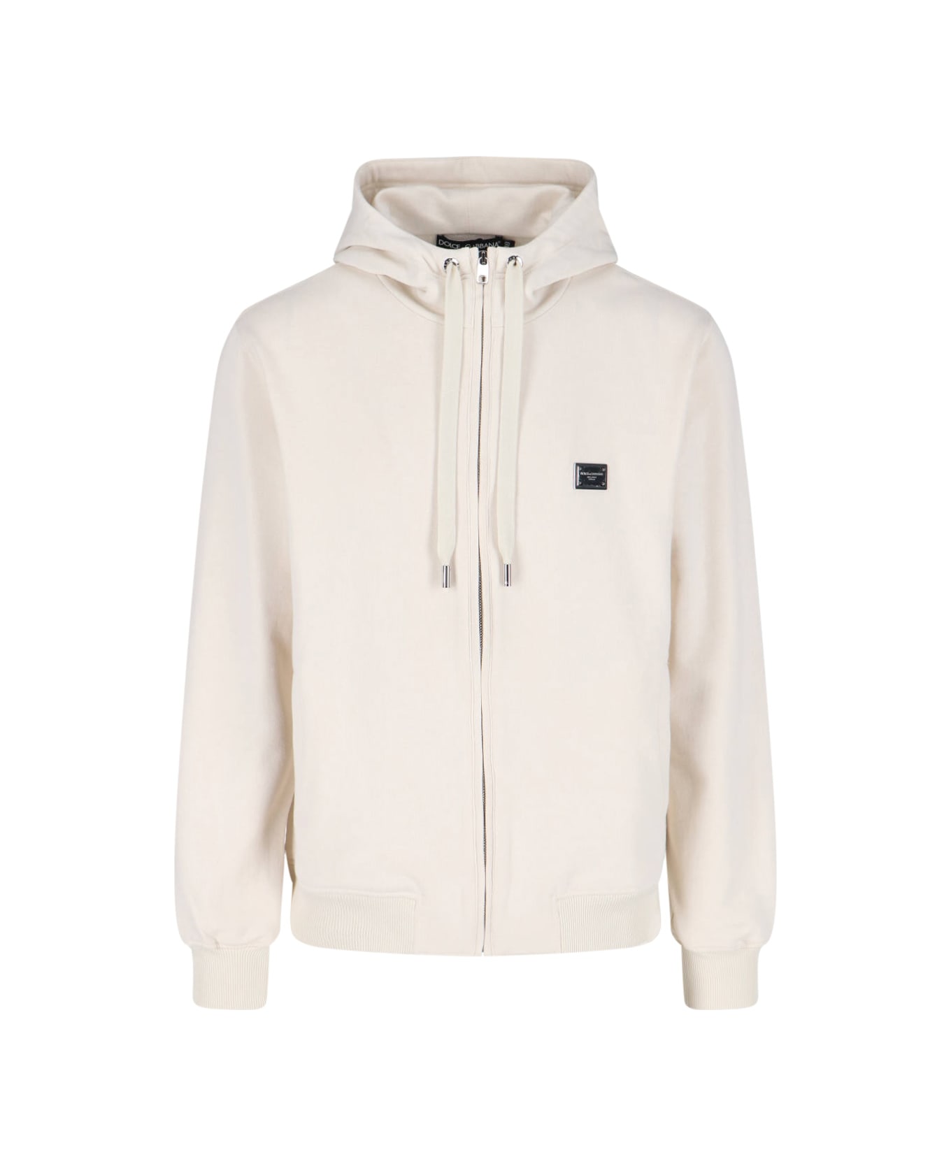 Dolce & Gabbana logo zip sweatshirt in cream cotton with drawstring hood, zip closure, silver metal plaque on the chest, engraved logo detail, two side pockets, ribbed trim, and straight hem. Composition: 100% Cotton