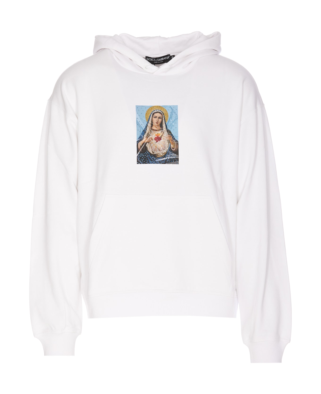 Dolce&Gabbana white hoodie, frontal print with strass detail, coulisse, elasticized cuffs, frontal kangaroo pocket Composition: 100% Cotton