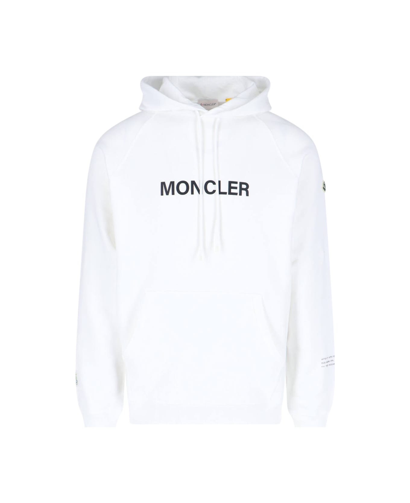 Moncler Genius X FRGMT Cartoon hoodie in white cotton with drawstring hood, contrast logo print on the chest, maxi front pocket, contrasting maxi logo print on the back, light blue details, multicolor logo patch on the sleeve, contrasting logo print on the sleeves, ribbed trim, and straight hem.
