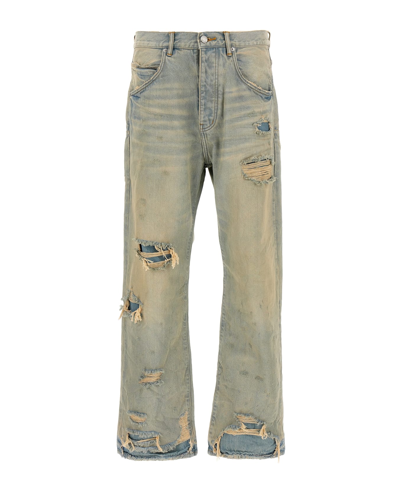 'P018 Verditer Destroyed' jeans in used-effect cotton denim with rips, double layer of fabric at the front, button closure, five pockets, low crotch and wide leg, back logo tag. Composition: 100% cotton