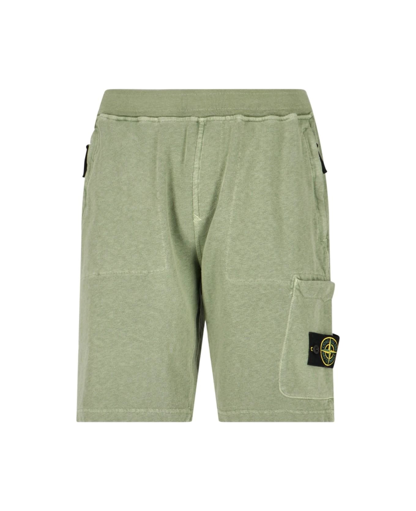 Stone Island green cotton atheltic shorts with elastic waistband, two side zip pockets, one side patch pocket, appliqué logo patch on the side, back welt pocket.