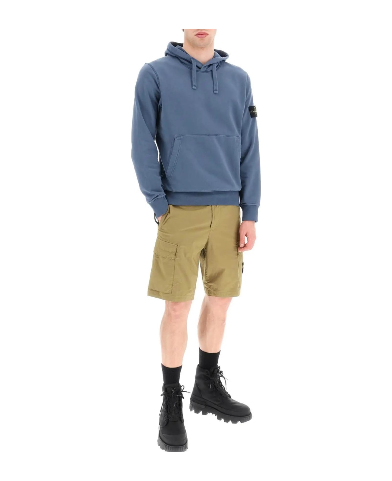 Stone Island hoodie in brushed-back cotton jersey, with detachable logo patch on the sleeve. Drawstring hood, back epaulette sleeves, kangaroo pocket, ribbed cuffs and hem. Regular fit. The model is 187 cm tall and wears a size L. Composition: 100% Cotton