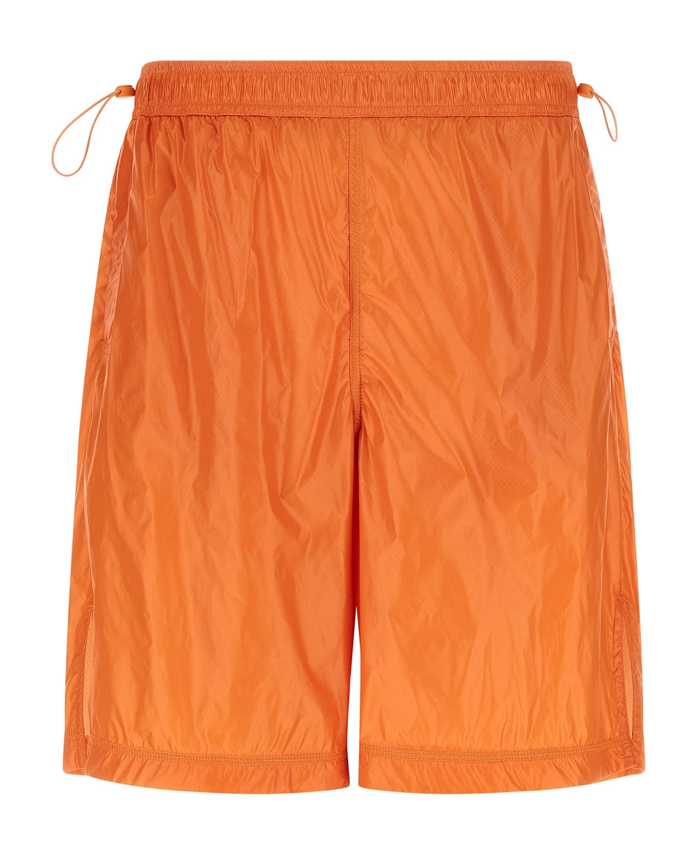 Light shiny nylon bermuda shorts treated with a special finish that makes the texture wind resistant and creates a wet effect, mesh lining, drawstring elastic waistband, pockets, side slits on the leg bottom.