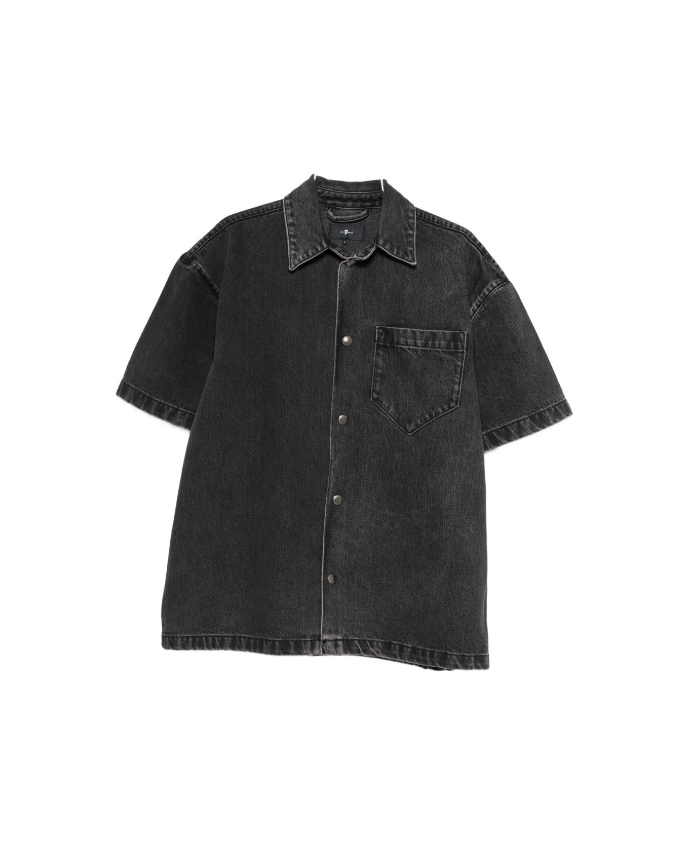 7 For All Man Kind Short-sleeved black cotton shirt, snap button closure, chest pocket, straight hem