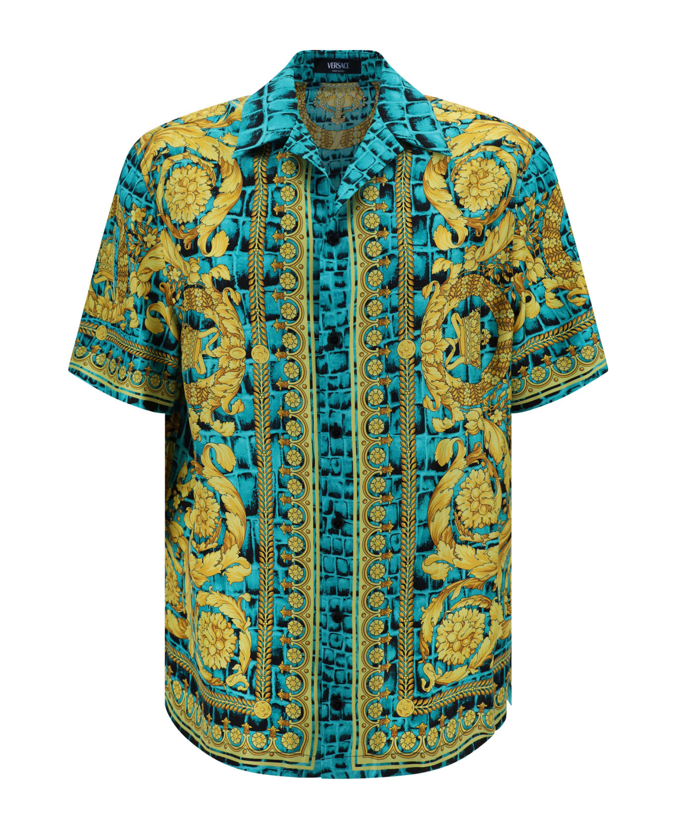 Silk shirt by versace, a classic collar, a front button closure, a short-sleeved design, the brand's iconic graphic pattern printed in contrast on the front, and a regular fit. Composition: 100% % Silk