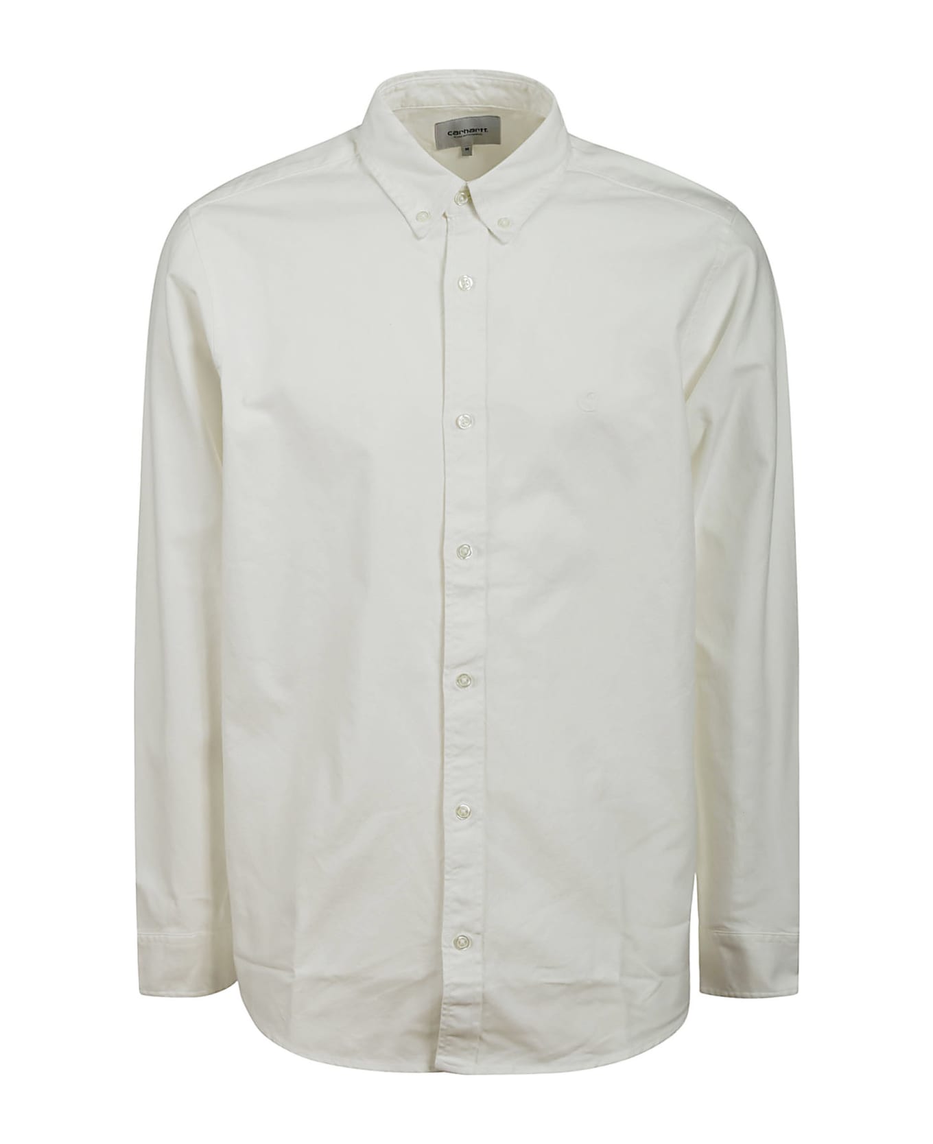 Carhartt White cotton shirt, button closure, button down collar, button cuffs, logo detail. Composition: 100% Cotton Oxford, 6.8 Oz