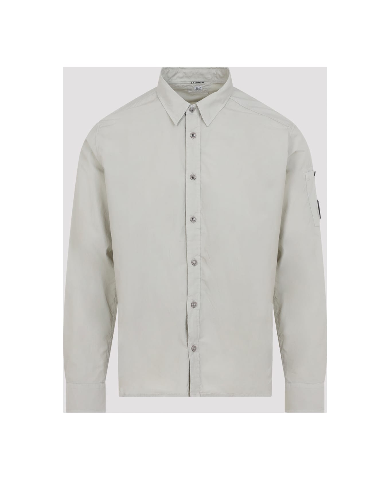 CP Company LS Beige Cotton Shirt. Crafted from beige cotton, featuring a pointed collar, front button fastening, long sleeves with buttoned cuffs, the iconic CP lens on the sleeve, and a straight hem.