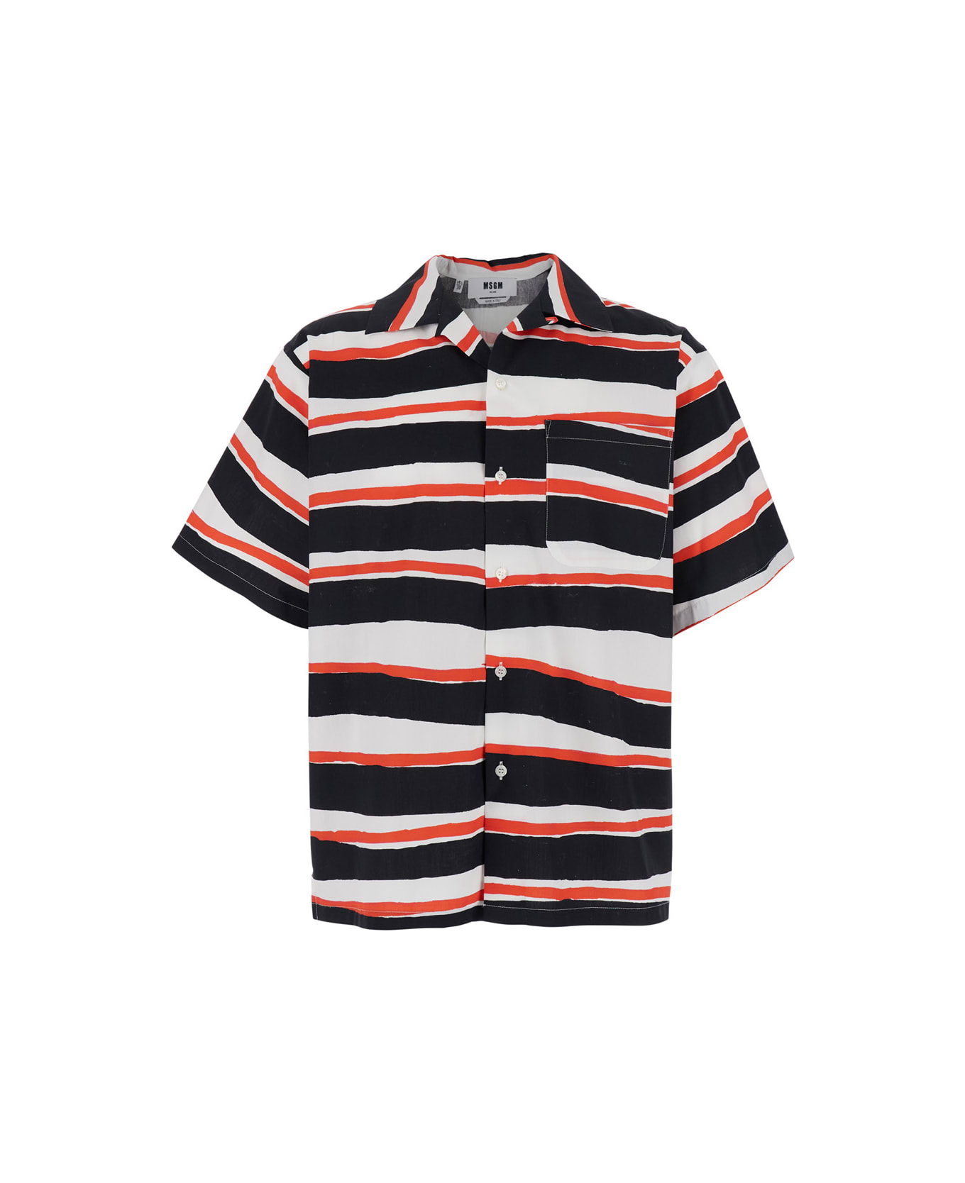 Shirt Multicolor Pointed collar Short sleeves Front button closure Front patch pocket All-over asymmetrical stripe pattern Contrasting stitching Straight hem Cotton Relaxed fit