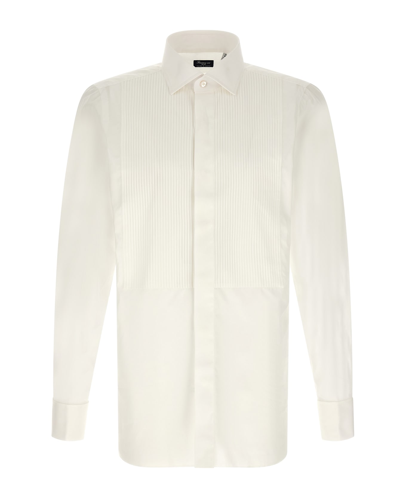 'Napoli Classic Tuxedo' shirt in fine Alumo fabric spun double twisted, tuxedo model with front plastron, 'Eduardo' French collar, concealed mother-of-pearl button closure on the front, long sleeves with cufflinks, tonal satin logo detail on the side slits.