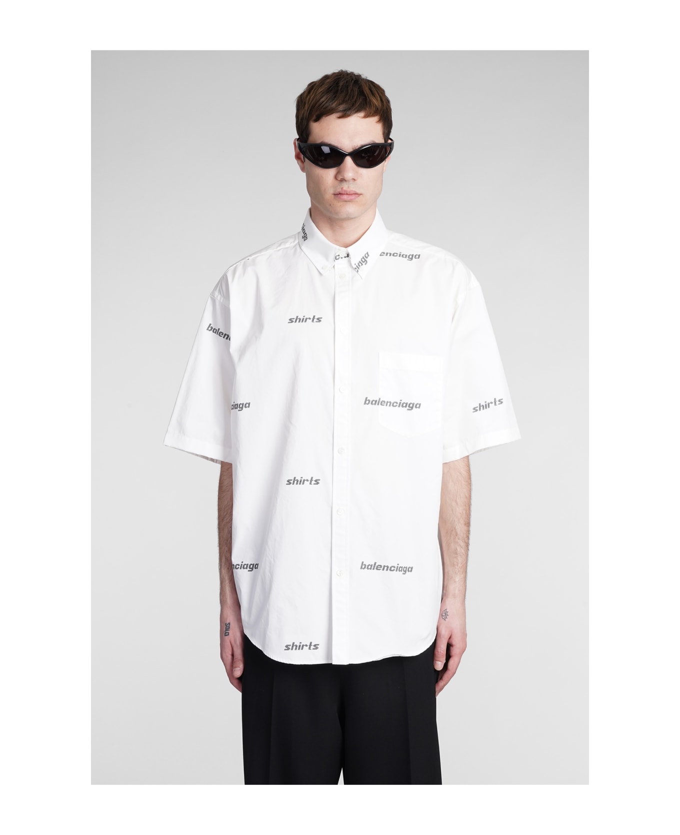 Shirt in white cotton, collar, short sleeves, frontal buttoning, breast pocket, logo all over, curved hem, 100% cotton, Made in Italy, Model is 1. 89cm and wear a size 38