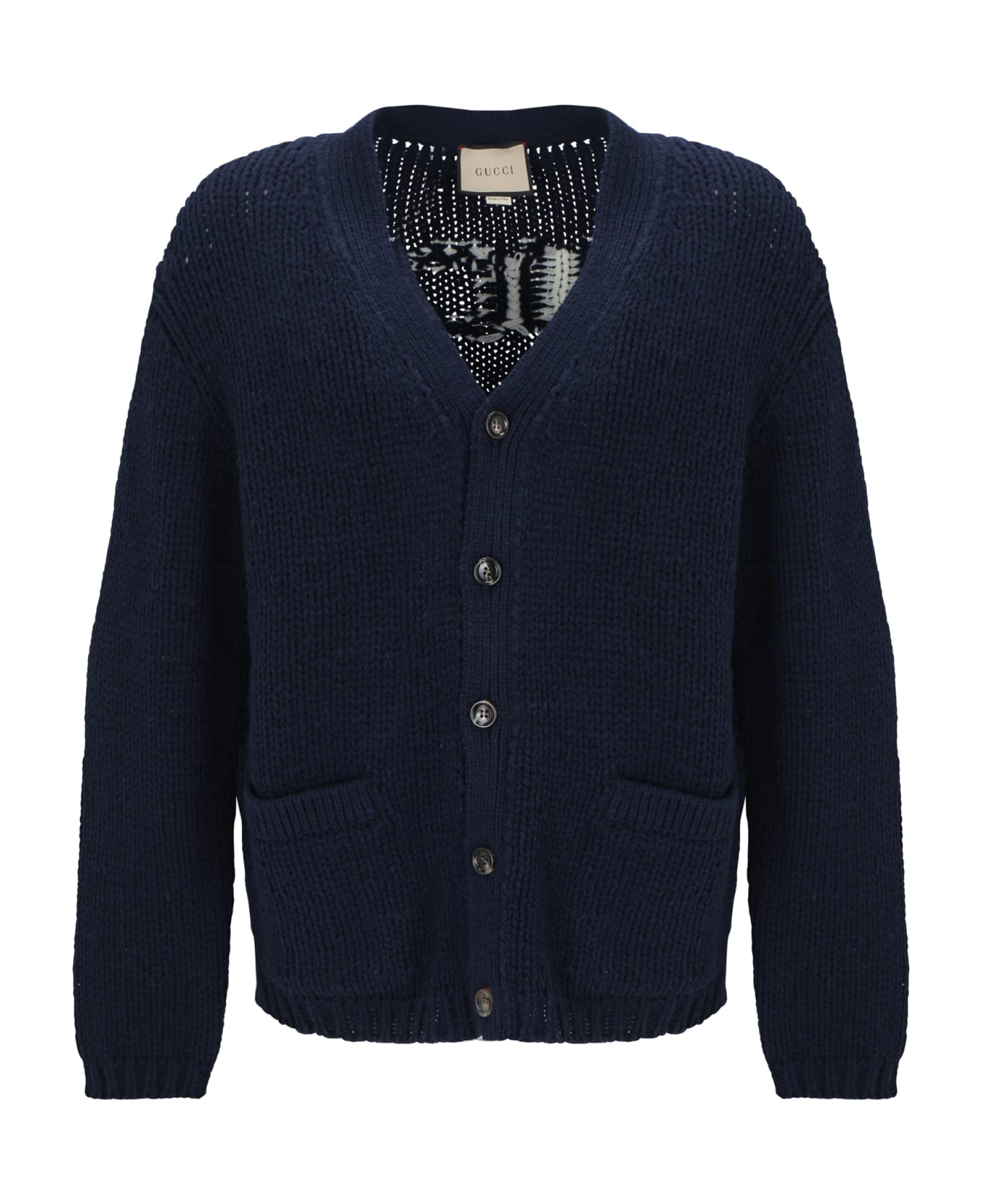 Wool cardigan by gucci, ribbed v-neck on front, front button fastening, two slit patch pockets on front, contrasting embroidered iconic brand monogram on back, monochrome design, regular fit. Composition: 100% % Wool