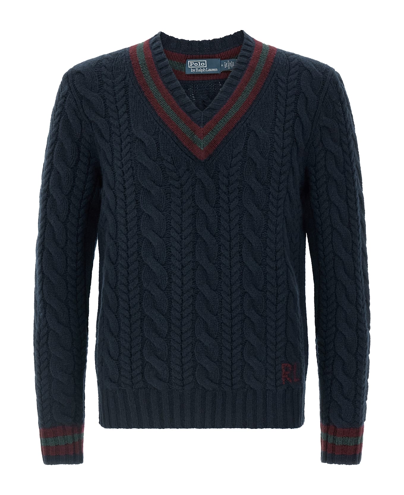 Cashmere blend wool sweater with cable knit, V-neck, logo intarsia, long cuffed sleeves. Composition: 90% wool, 10% cashmere