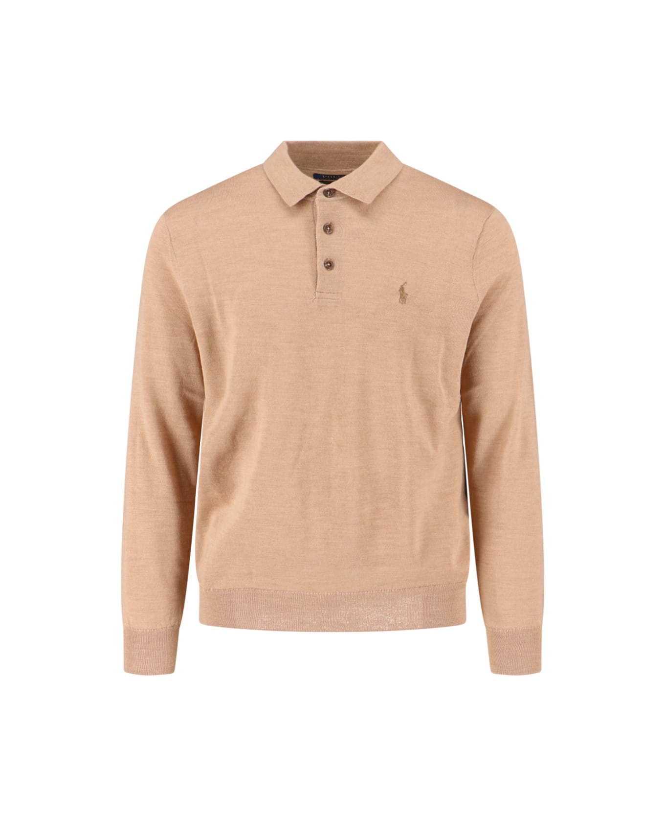 Polo Ralph Lauren beige wool sweater with classic collar, button closure, tonal chest logo embroidery, ribbed trim, straight hem. Composition: 100% Wool
