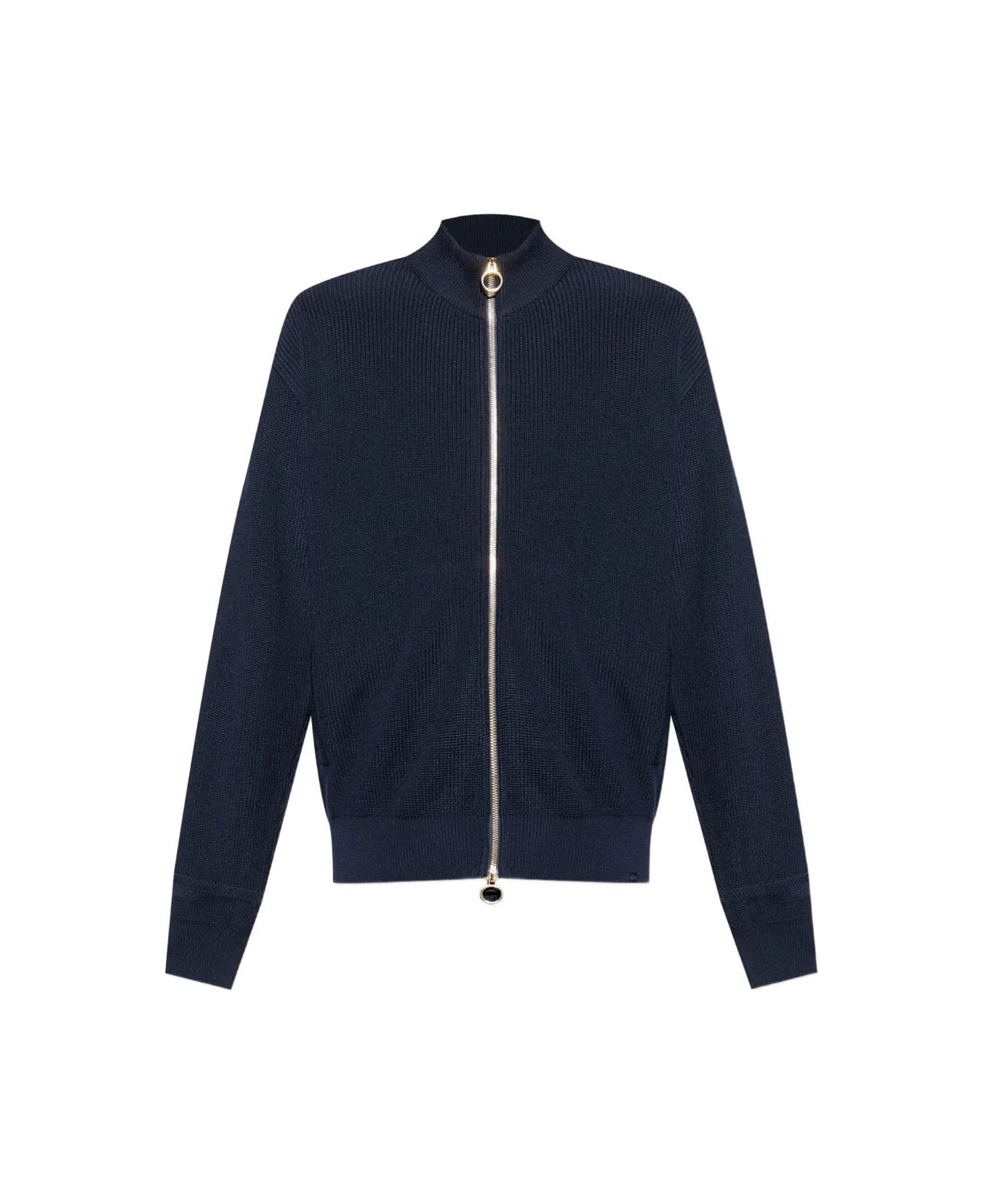 Full-zip sweater in dark blue with gold accents, crafted from a blend of virgin wool and acrylic for comfort and breathability. Featuring a high collar, side pockets, and English rib knit, it offers a regular fit, making it perfect for smart-casual looks. The "Shark" logo on the sleeve adds a distinctive touch.