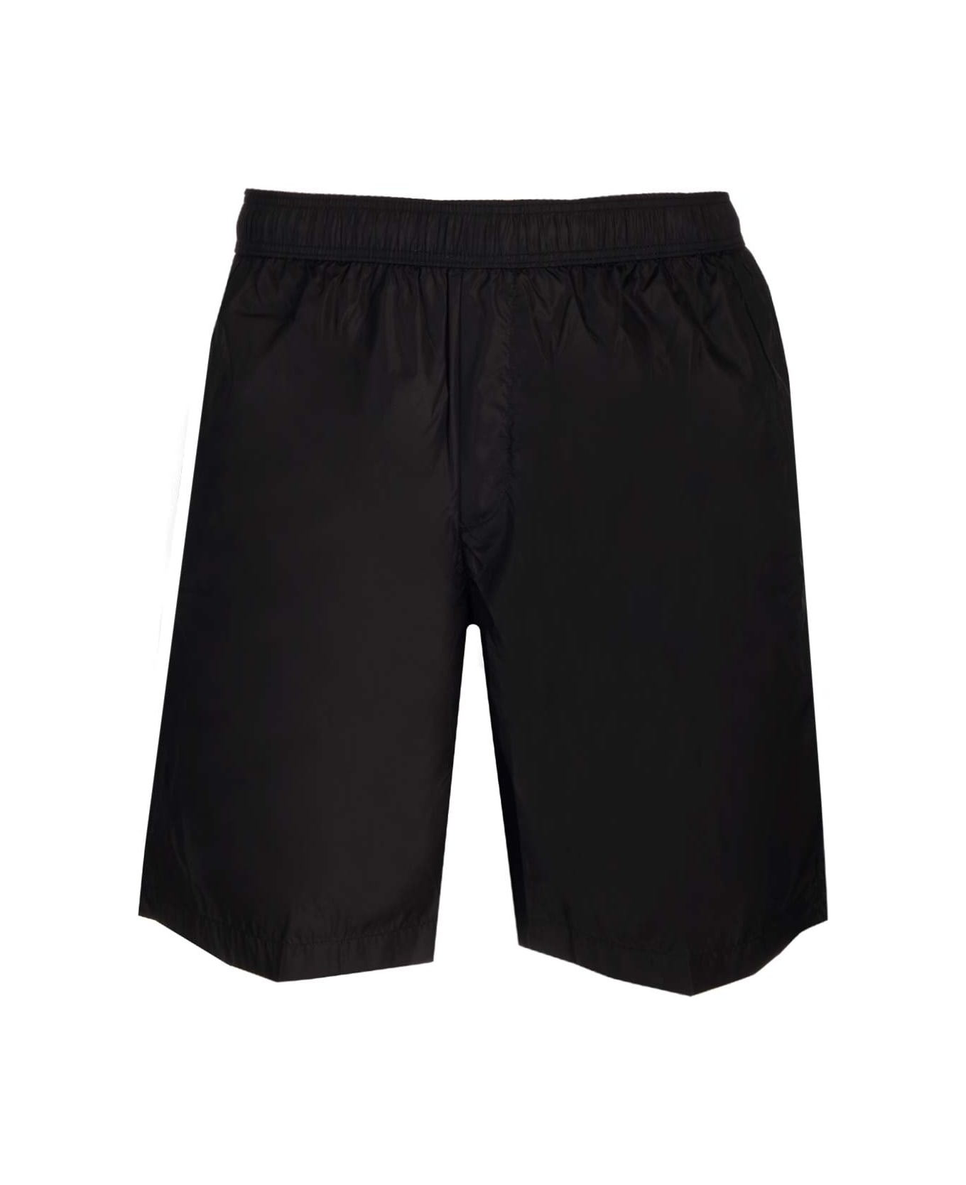Black technical fabric swimsuit by Moncler with elastic drawstring waist, welt pockets and side lettering logo. Composition: Ext. Composition:BASE FABRIC: 100%POLYAMIDE/NYLON Int. Composition:LINING: 100%POLYAMIDE/NYLON