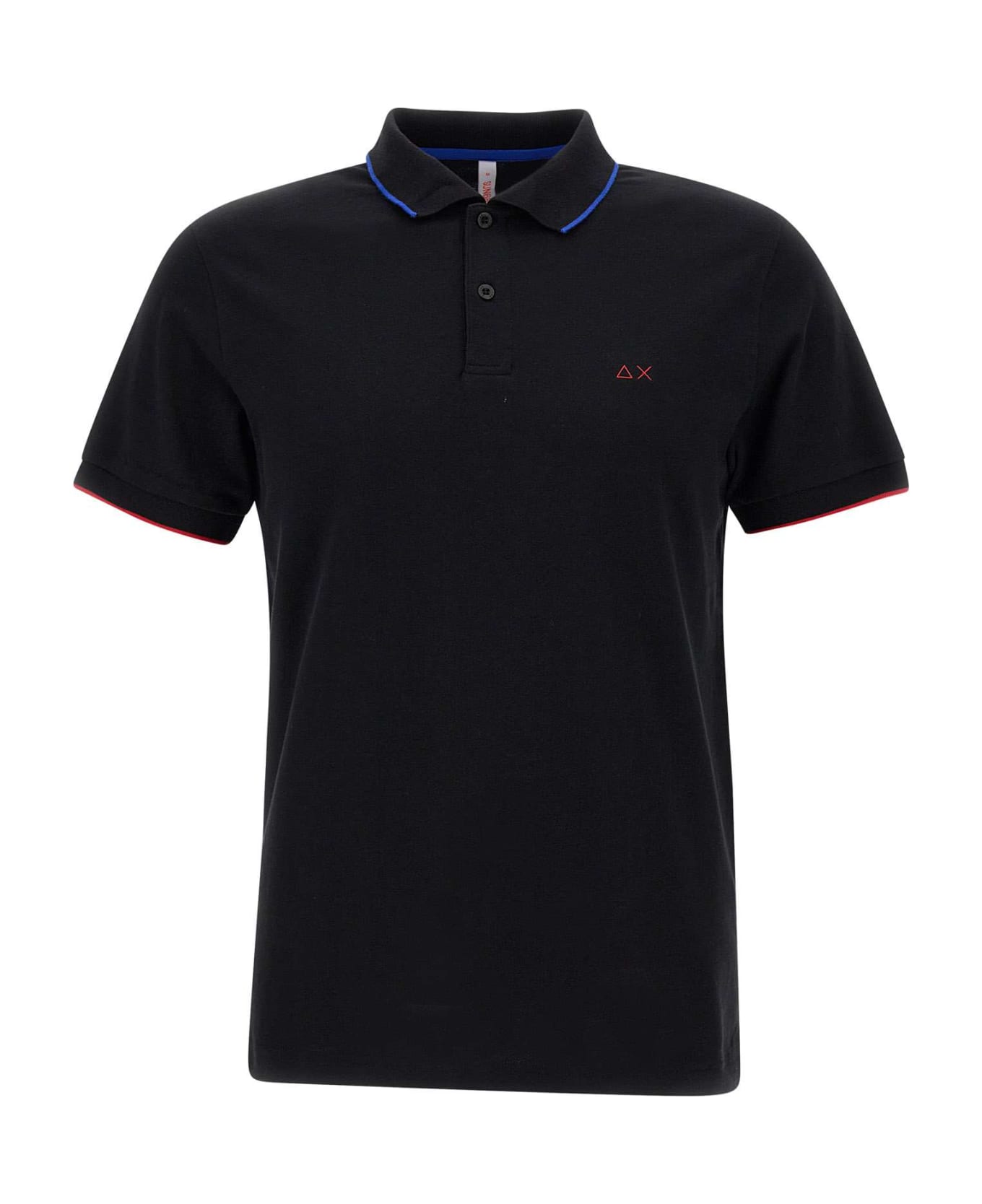 Sun68 men's cotton polo shirt, black with multicolor profiles, ribbed edges, classic collar, two-button fastening, short sleeves, side slits on hem, embroidered logo on chest, regular fit.