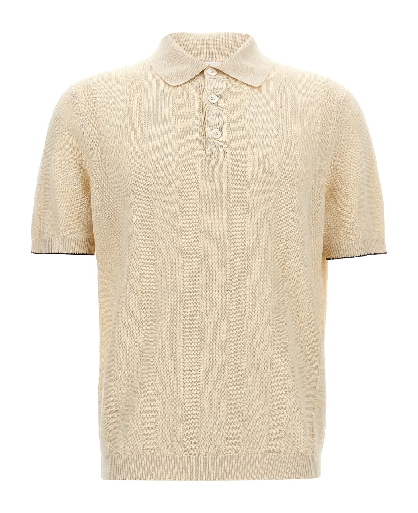 Wide-ribbed knit polo shirt in linen and cotton knit, collar and button, short sleeves with contrast detail. Composition: 77% linen, 23% cotton