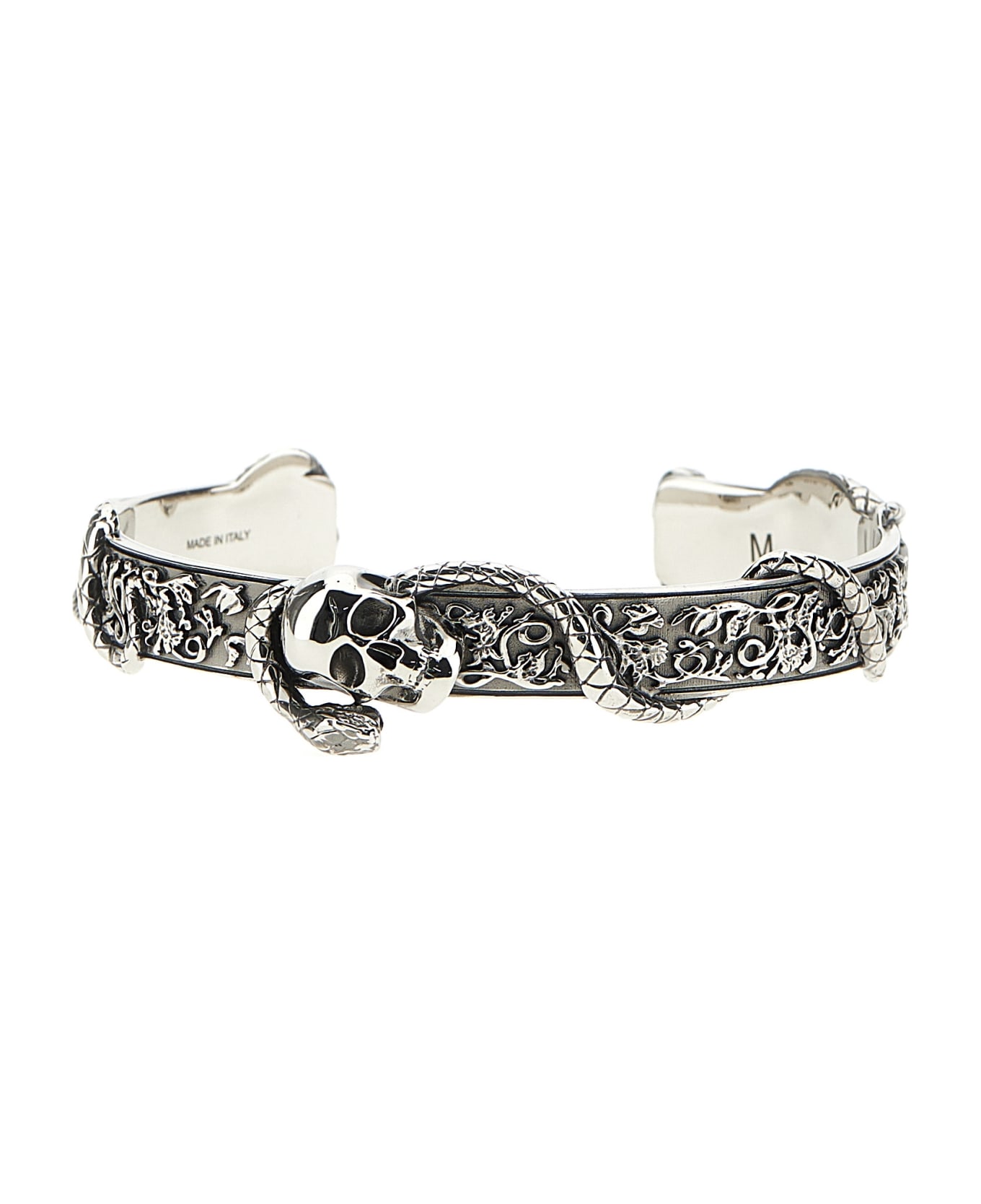 Skull & Snake bangle in silver metal featuring embossed details. Composition: