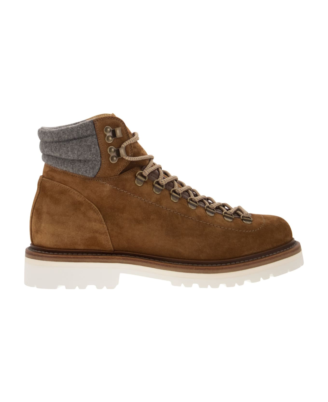 Designed to complete casual and dynamic outfits, Mountain boots in suede are a contemporary reinterpretation of classic outdoor models. The velvety texture of the leather adds a refined note perfect for the city, while the back insert in virgin wool perfects warmth and protection. Details inspired by technical trekking footwear, such as metal eyelets, round laces and the bottom with rubber cart mold complete the sporty style of the shoe. - Closure with round fabric laces - Textile round spare straps - Leather lining - Sole in lightweight polyurethane foam DESIGNER ID: MZUPEFS890 CGC81