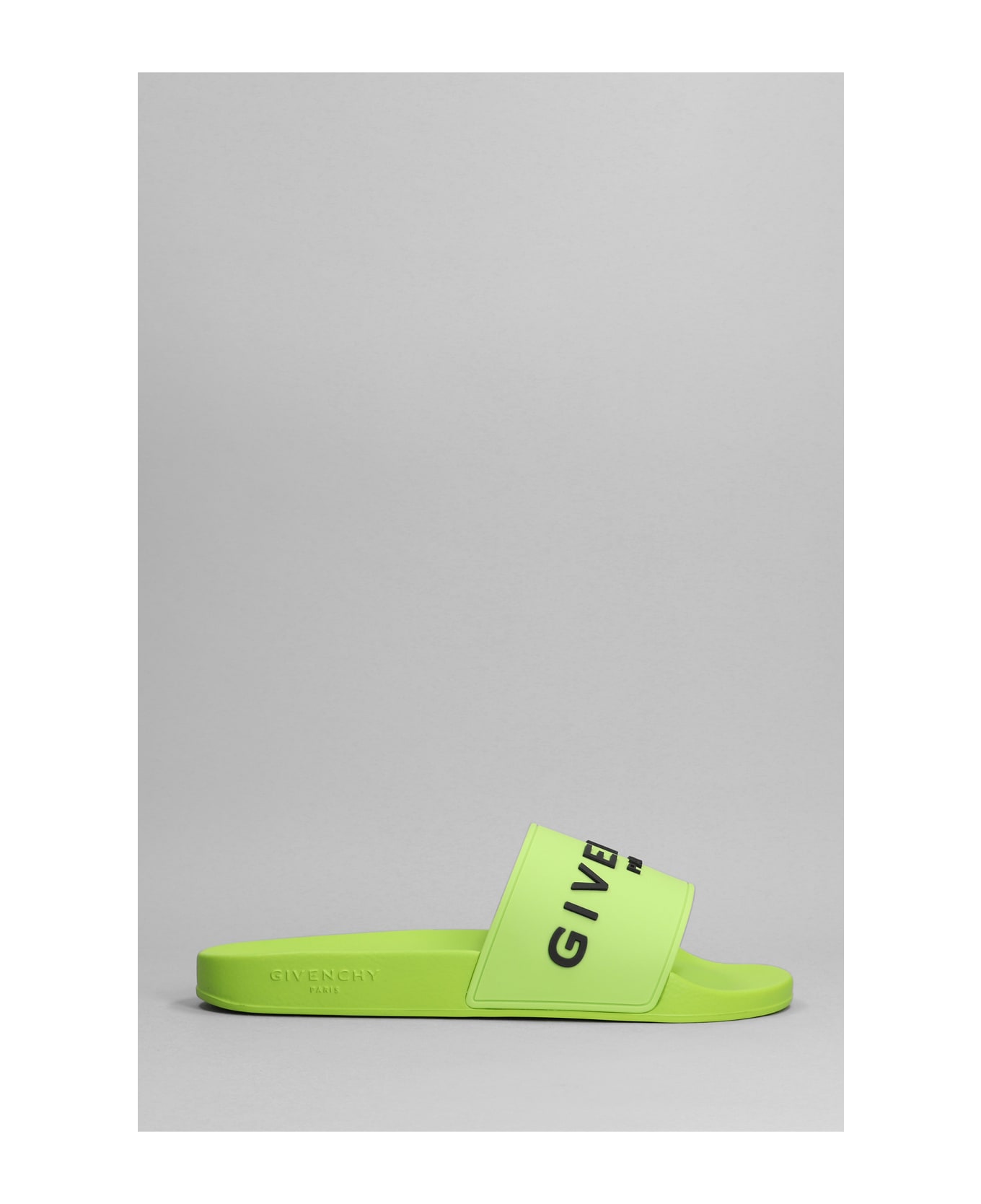 Flats in green rubber/plasic, one strap, logo printed, rubber outsole, Made in Italy