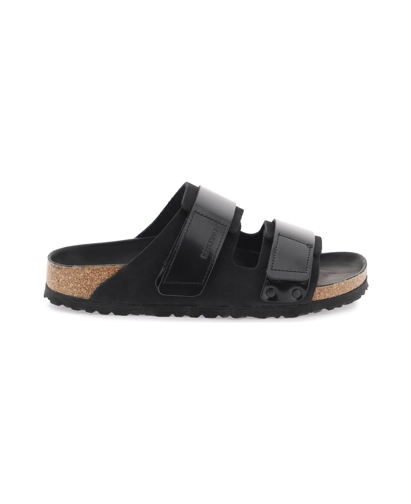 Birkenstock Uji slides made of nubuck leather with adjustable straps in shiny leather, anatomical cork and semi-exquisite latex footbed, and EVA sole.
