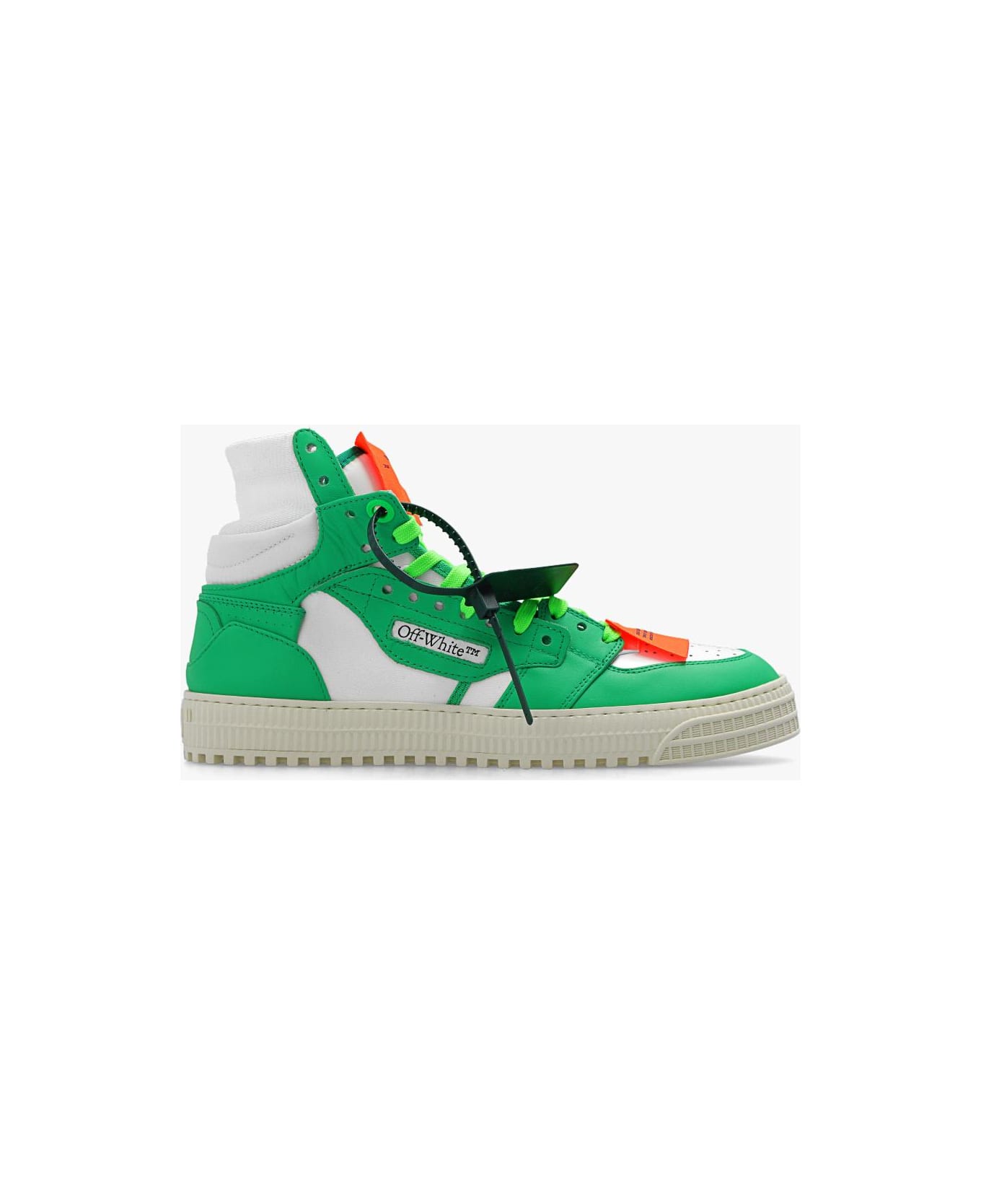 White and green '3. 0' high-top sneakers from Off-White. Resting on a cream rubber sole, this lace-up pair is complete with neon tongue patches, black logo and the brand's signature zip tie in dark green.