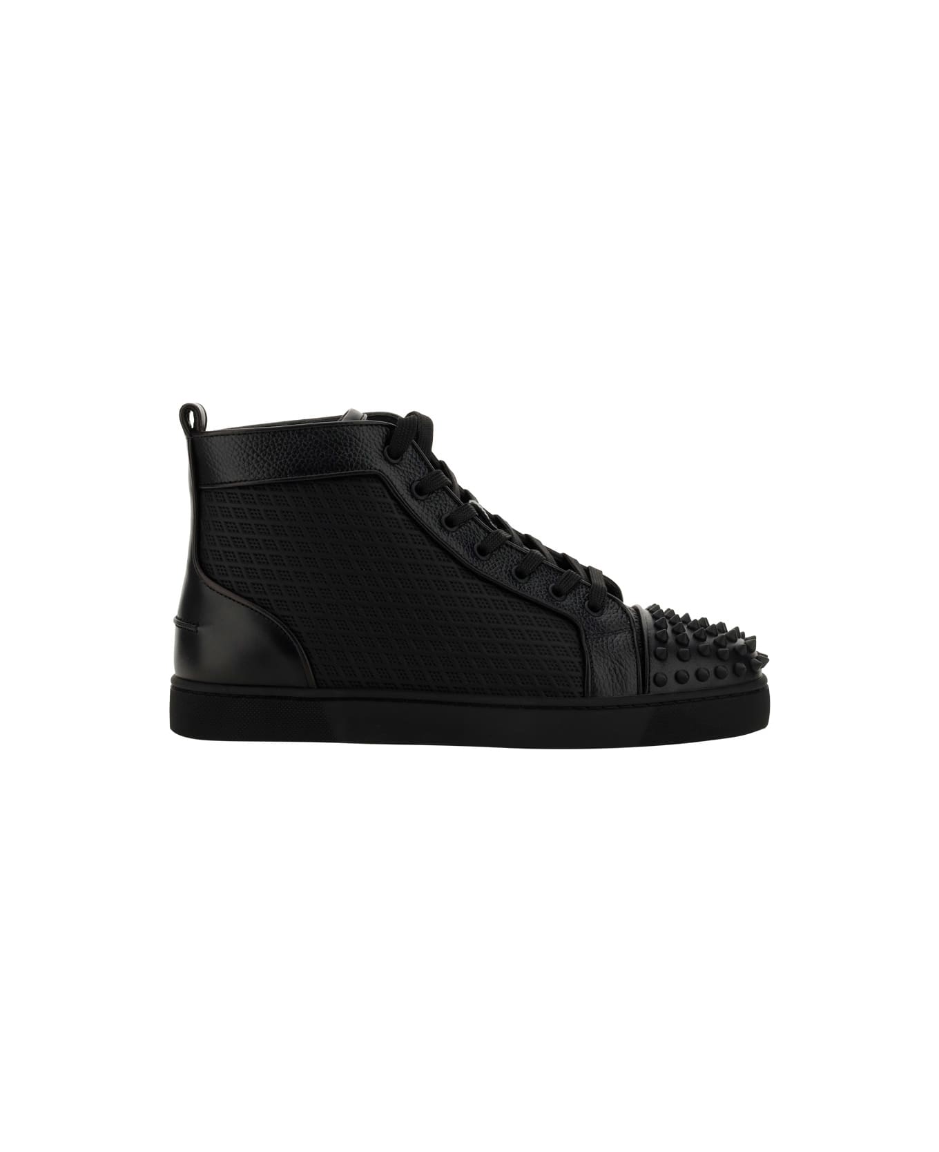 Calfskin lou spikes orlato by christian louboutin, ankle-length design, round toe, iconic all-over embossed applied pointed studs on toe, front lace-up closure, tone-on-tone iconic brand monogram patch applied on inner side panel, logoed insole.