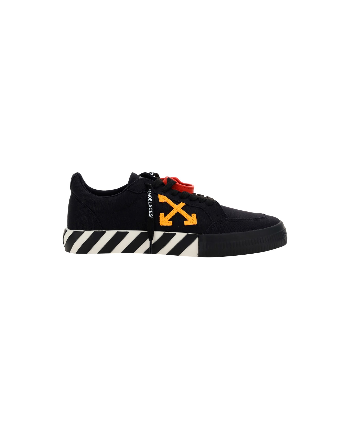 Cotton low vulcanized sneakers by off-white, iconic zipper tie tag on front, front lace-up closure, contrasting brand logo on outer side panel, iconic brand signature printed on front tab, sole with iconic two-tone slanted bands.