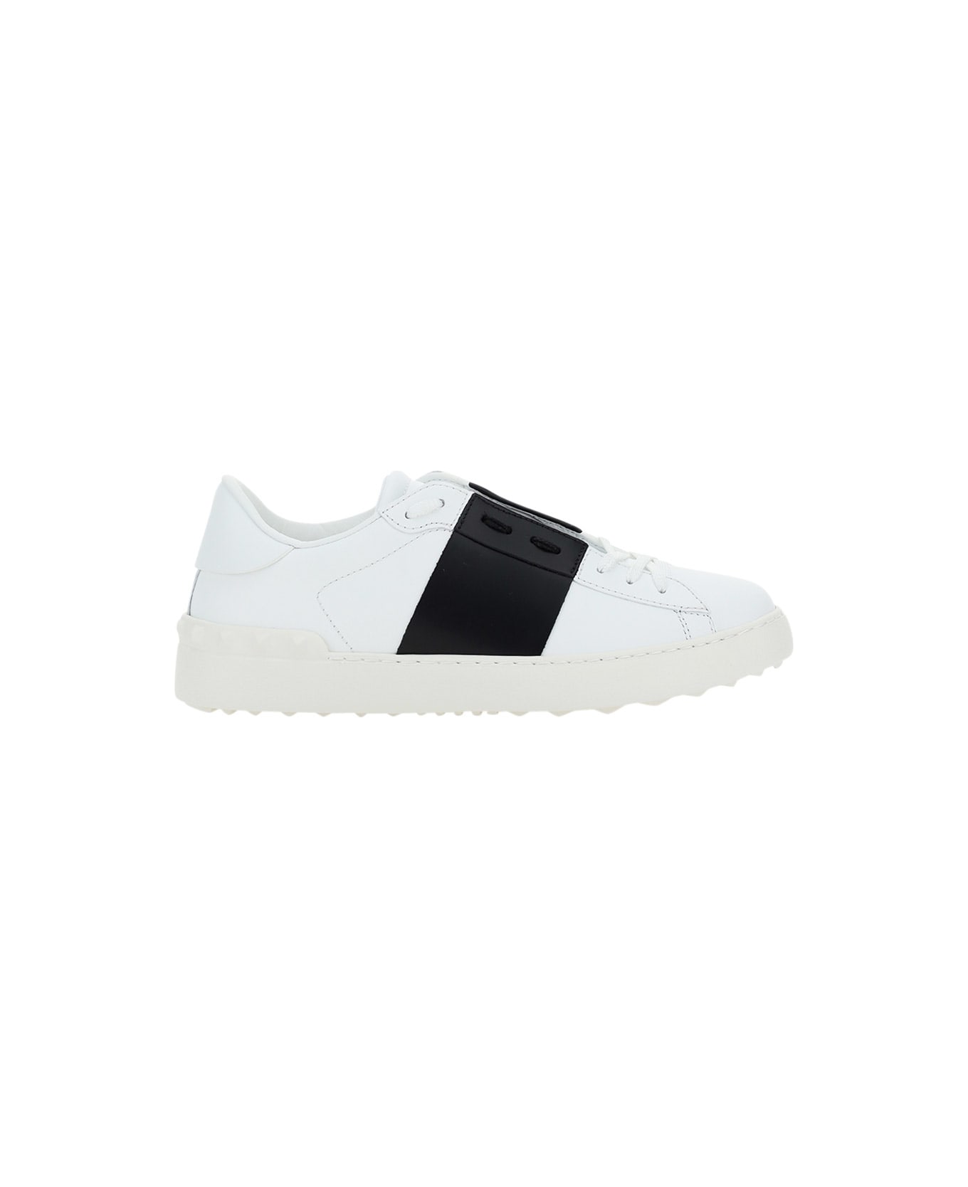 Calfskin open sneakers by valentino garavani, round toe, flat sole, slip-on lace-free style, iconic brand signature press-stamped on front tongue, small iconic brand studs applied tone-on-tone on heel, contrasting maxi band on back and side panels of shoe. Composition: 100% % Calf Leather Bos Taurus, 100% % Rubber