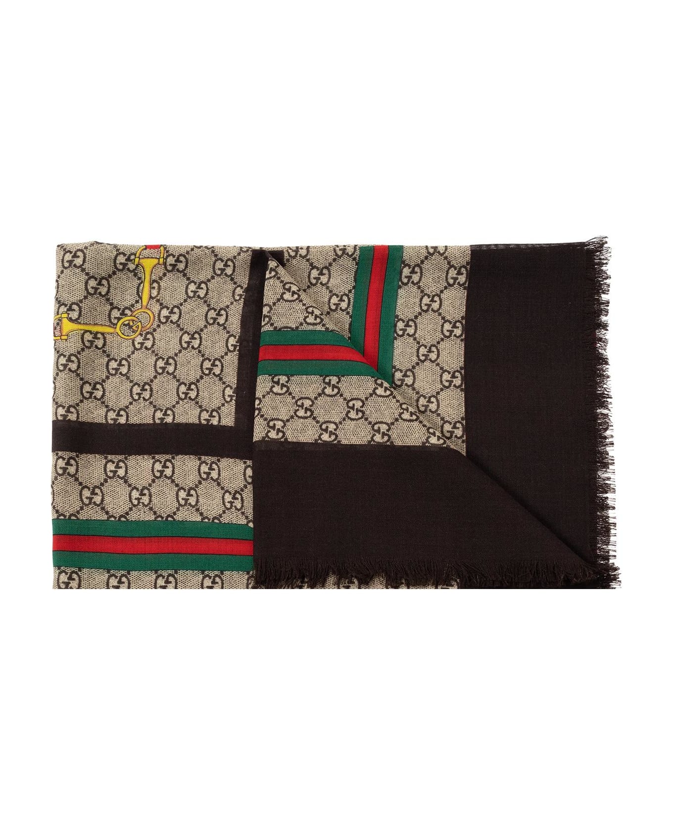 Brown and beige shawl from Gucci. Crafted from a wool and silk blend, this item showcases the 'GG' pattern, frayed edges and the brand's signature green and red 'Web Horsebit' stripe detailing. Composition: 70% Wool 30% Silk