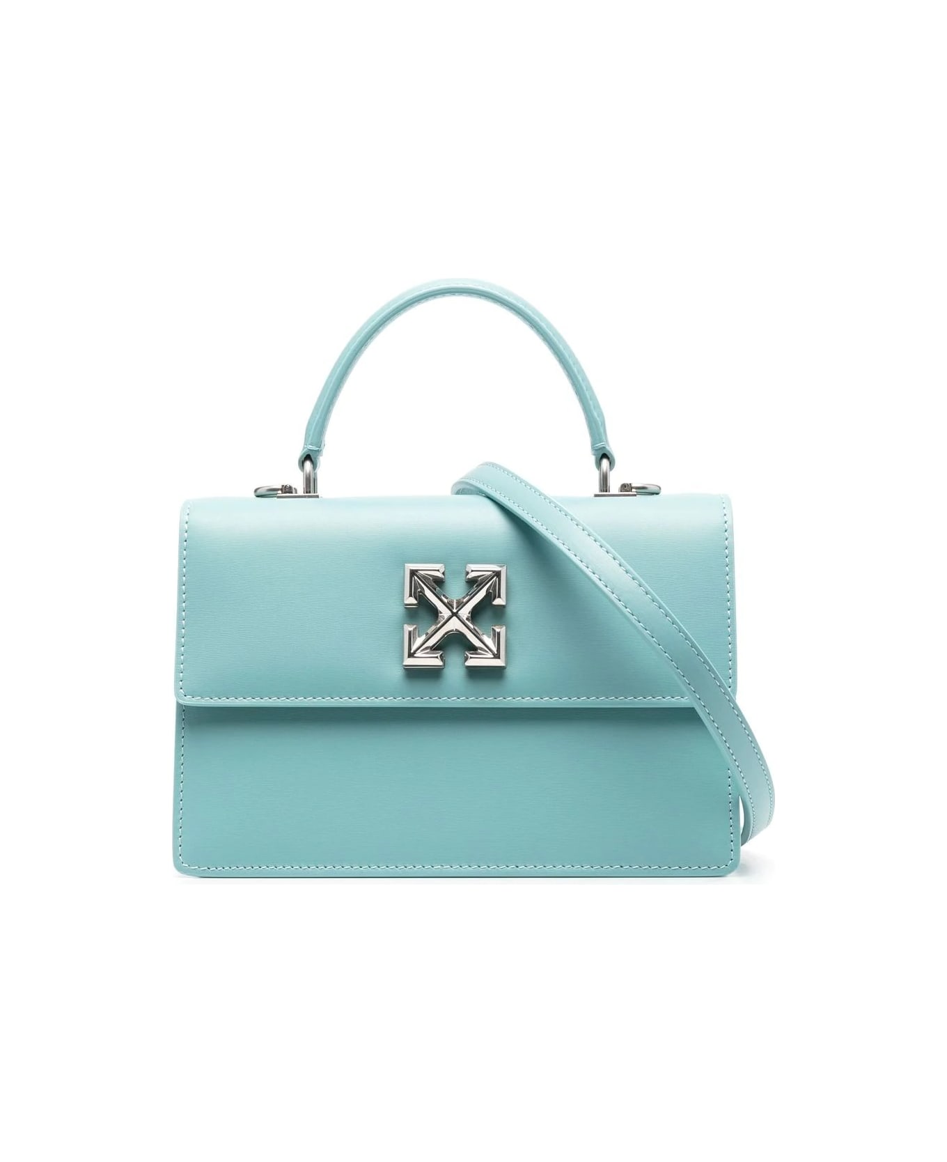 Jitney 1. 4 handbag by Off-White in light blue leather with a silver-coloured Arrow pattern on the front. The bag features interior compartments, a pocket on the back, a flap with magnetic closure, a removable tone-on-tone shoulder strap and a zipped staple pocket.