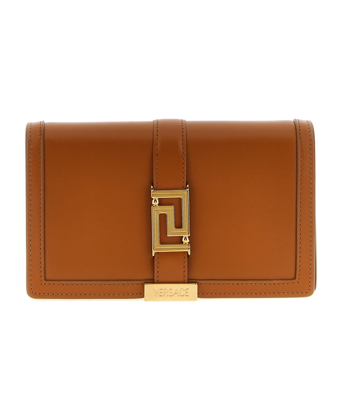 Mini Greca Goddess' leather clutch bag featuring metal details, removable chain shoulder strap and a magnetic flap closure. Composition: 100% calfskin leather