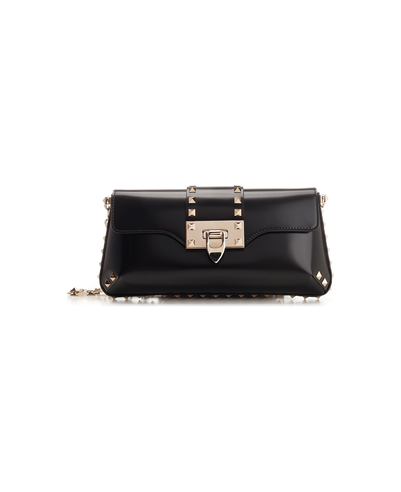 Black "Rockstud" shoulder bag from Valentino Garavani in brushed leather, profile and details decorated with studs and functional chain element characterized by the iconic studs, wearable by hand or on the shoulder/cross-body thanks to the extendable shoulder strap, studs and metal parts with platinum finish , iconic hook closure, leather lining, internal flat pocket, chain shoulder strap with central opening hook and additional leather portion, dimensions: W26xH13xD7 cm
