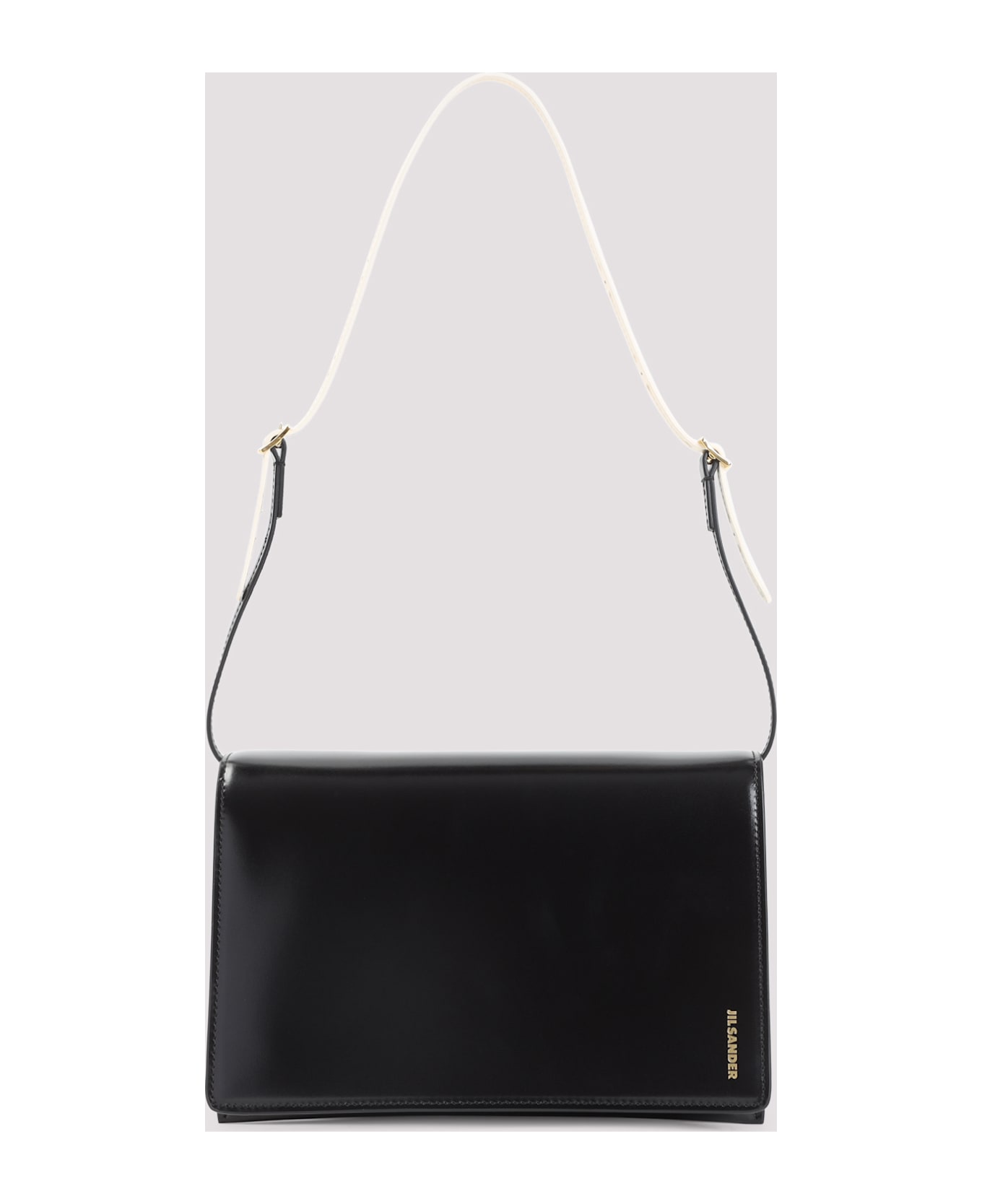 Jil Sander File Black Calf Leather Shoulder Bag. Crafted from black calf leather, featuring an attachable and adjustable shoulder strap, a front stamped logo, a concealed magnetic button fastening, inner gusset construction, and nappa lining.