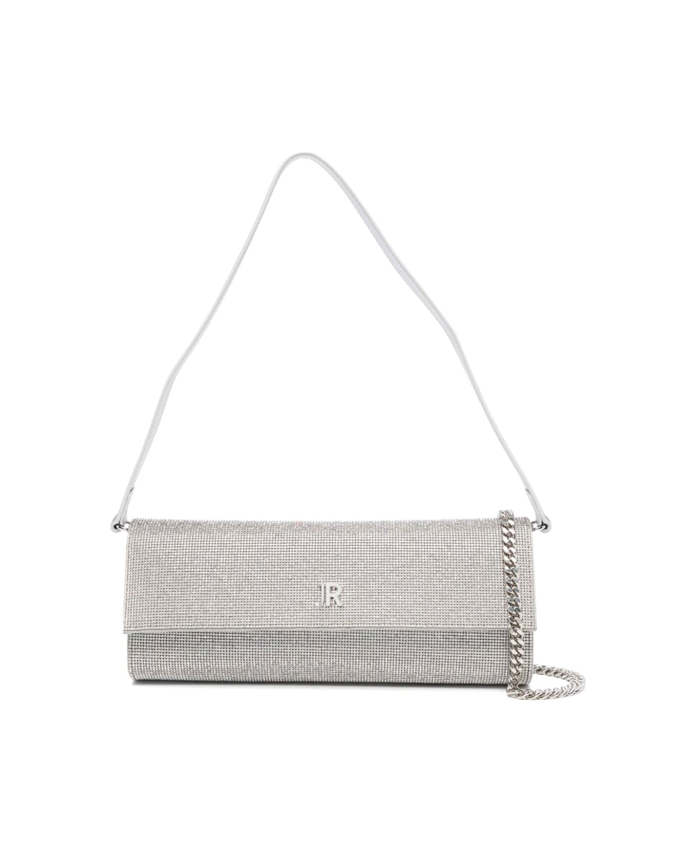Clutch bag with flap closure and metal logo.