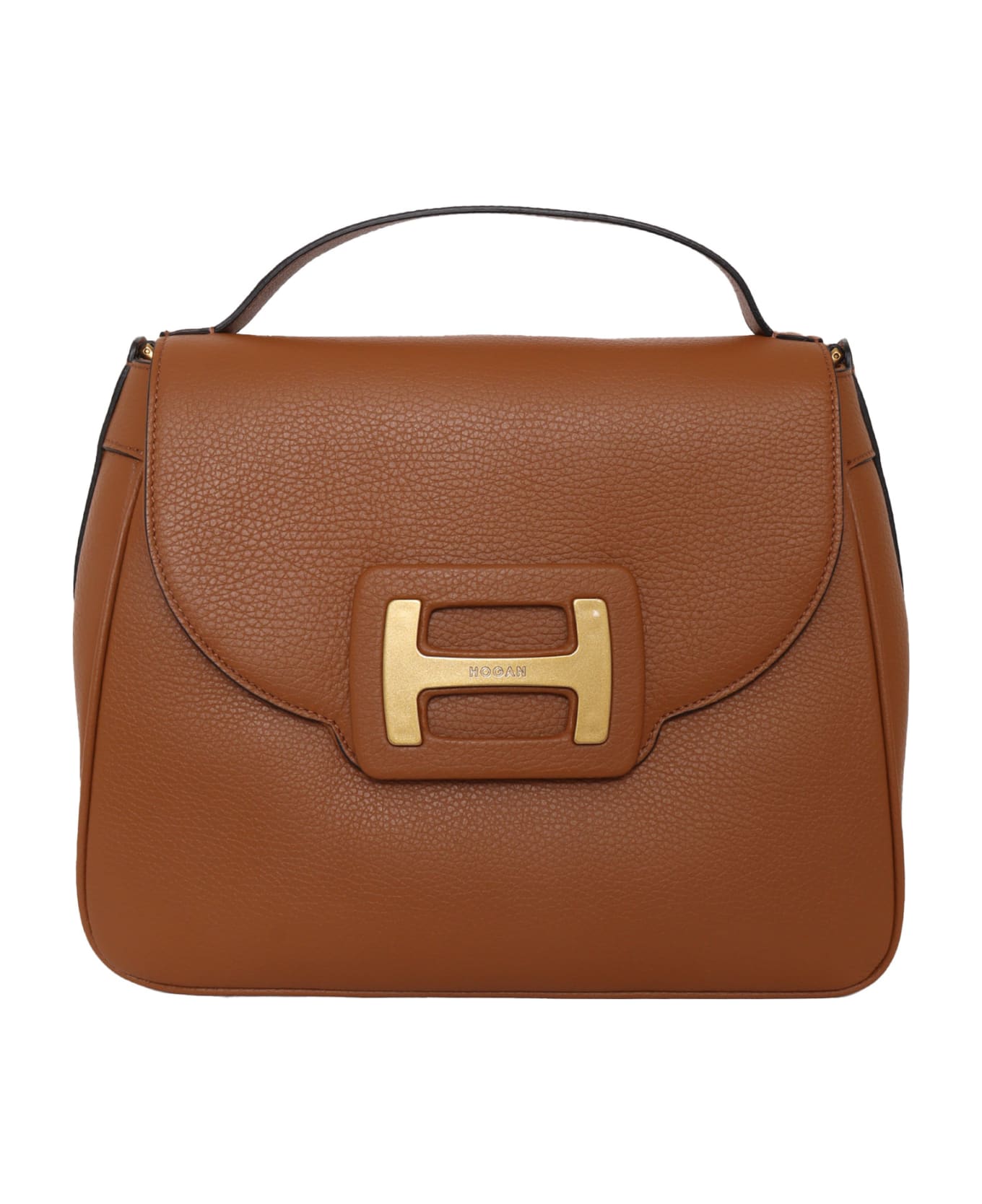 Leather bag, H buckle with Hogan logo, flap and magnetic button fastening, cotton lining, inside pocket with zip, top handle, fixed shoulder strap in leather and metal