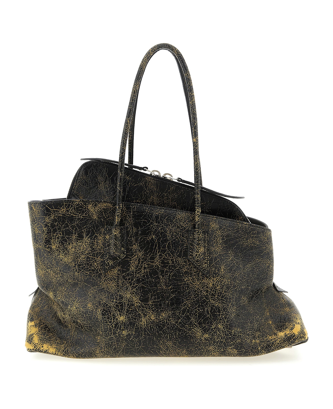 'La Passeggiata Medium' shoulder bag in used crackle leather with front embossed logo, double fixed tubular handle, top zip closure, side pockets, rigid base with metal logo feet. Composition: 100% calfskin leather (Bos Taurus)