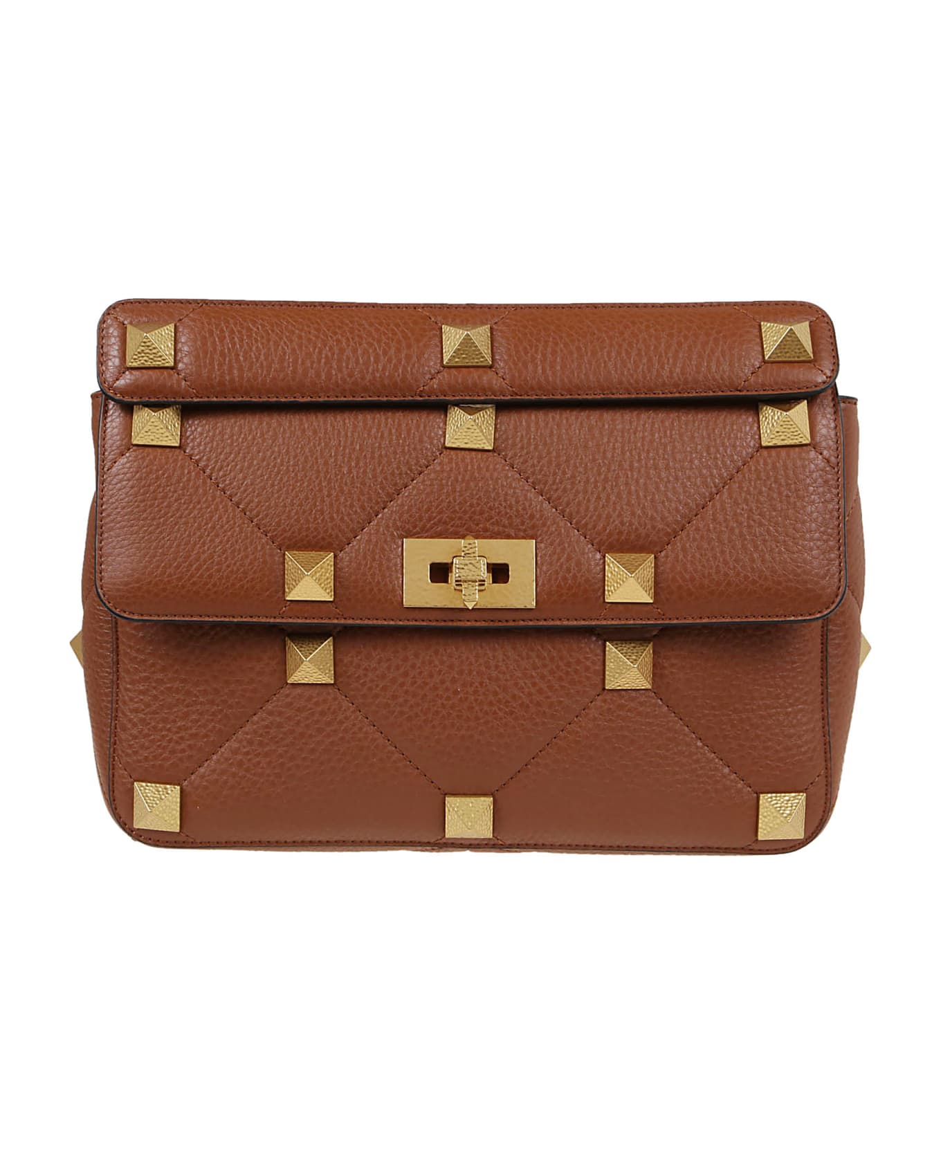 Large bag with Roman Stud chain BY VALENTINO GARAVANI. In saddle-colored garnet lamb nappa. Featuring a quilted nappa leather with a break-in texture with tone-on-tone stitching and embellished with hammered effect maxi studs, brand features of the antique brass color like the other metal parts. Turn lock closure; inside zip pocket and two flat open pockets. The bag can be worn either on the shoulder or by hand thanks to the removable handle and the shoulder strap also in leather. Ideal for an elegant and feminine outfit with both sneakers and heels!