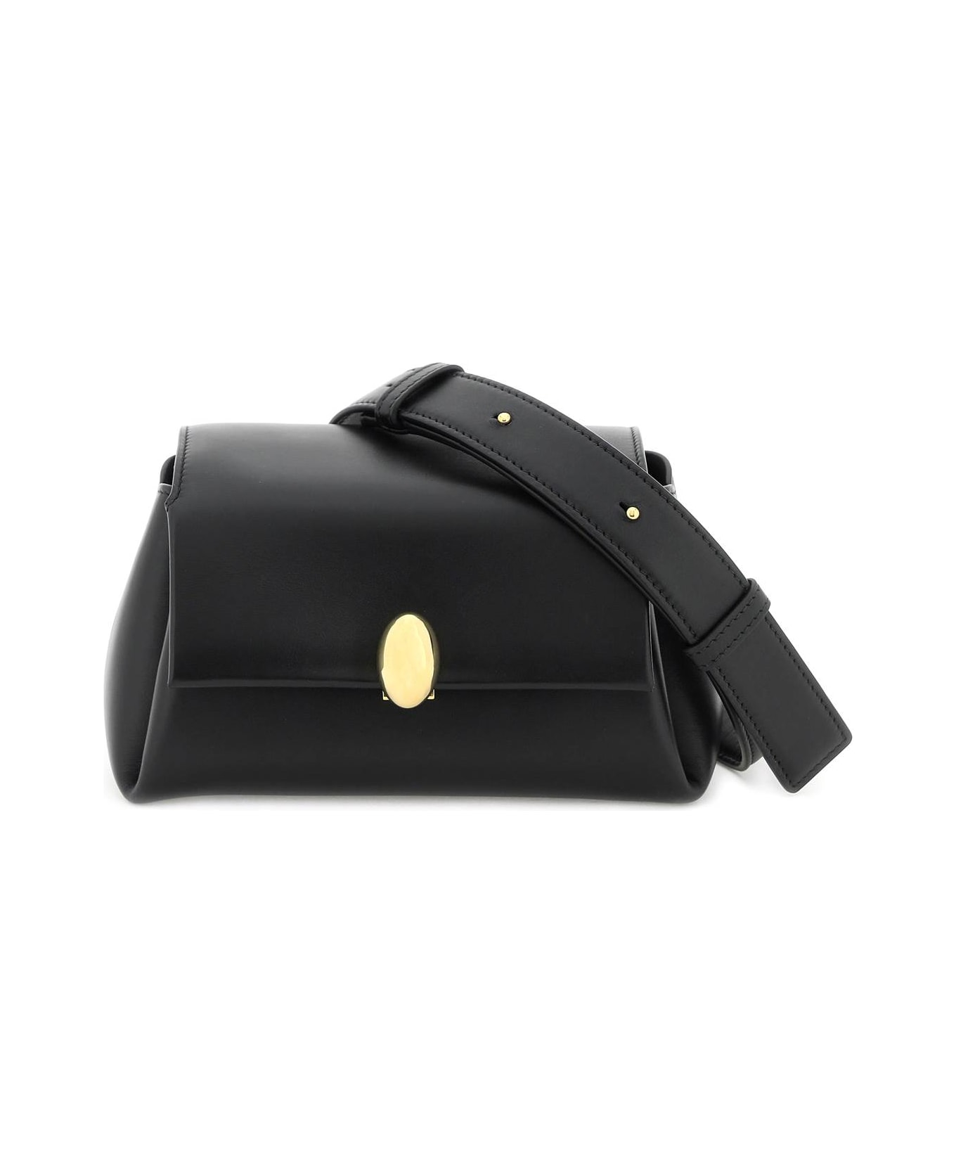 Jil Sander leather crossbody bag featuring a rounded gold-tone metal clasp. Interior with two gusseted compartments, a central zippered pocket and a credit card slot. Adjustable handle and gold-finished metalware.