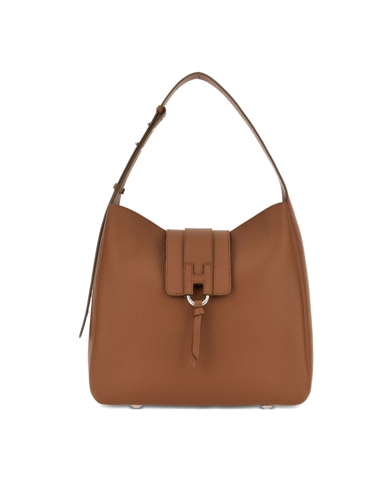 brown adjustable top handle logo buckle silver-tone hardware pebble grain finish
