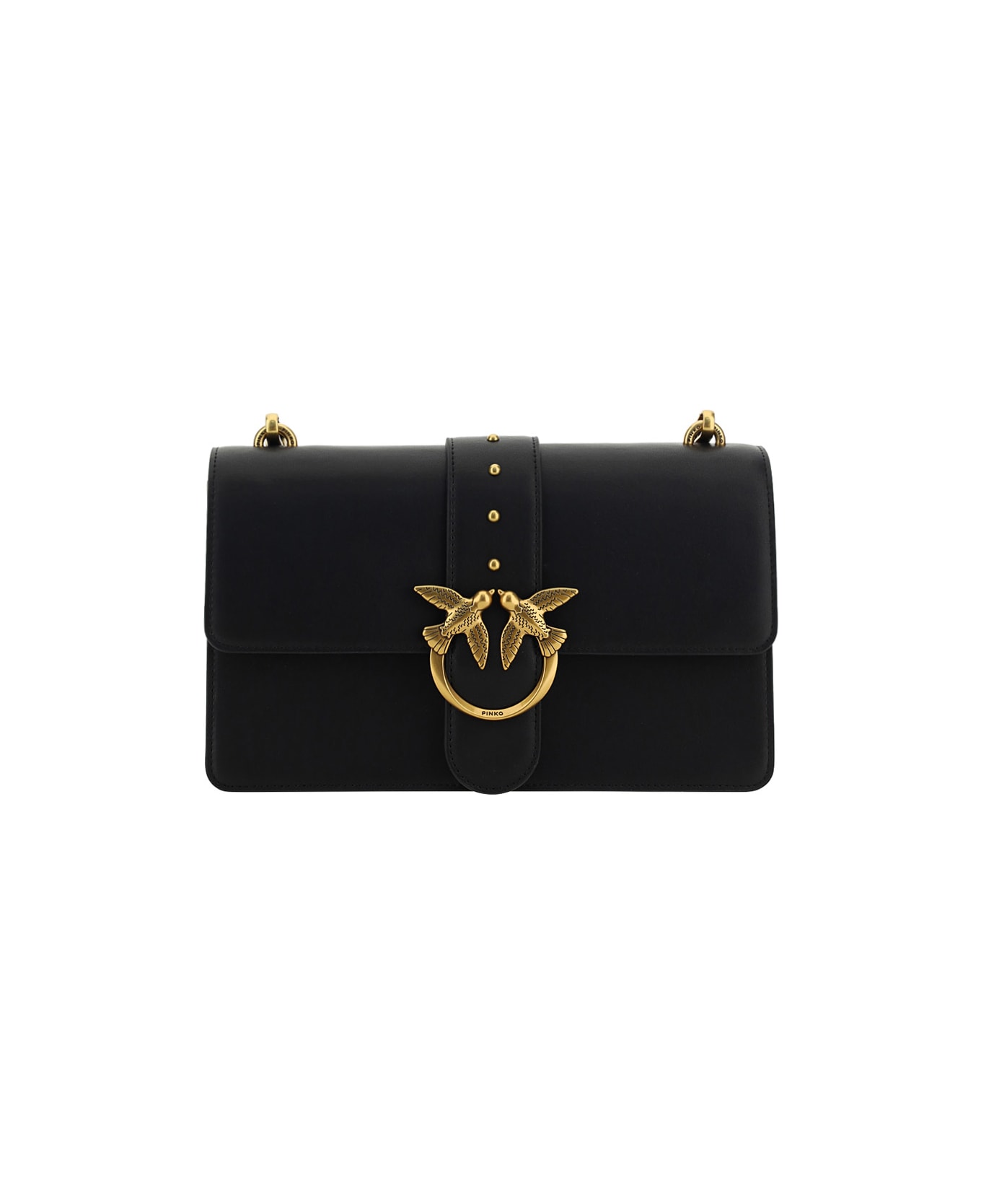 Calfskin love one classic shoulder bag by pinko, front closure with magnetic button, iconic gold-plated love birds logo embossed on the front, smooth leather design, double internal compartment, chain shoulder strap with adjustable leather part, internal slit pocket.