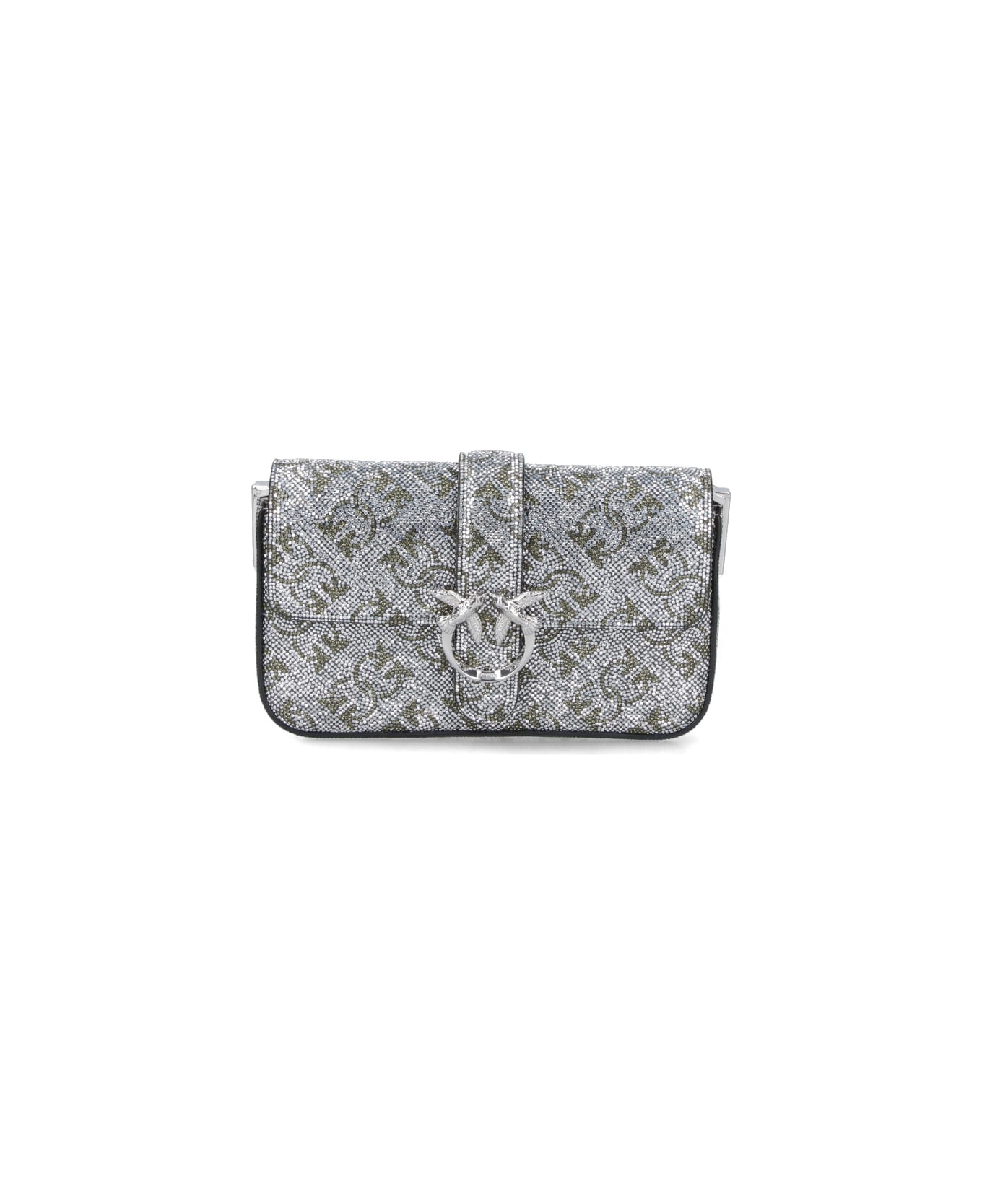 Pinko 'Love one sloucht baby' crossbody bag in grey leather with all-over crystals, adjustable and removable leather and metal shoulder strap, magnetic flap closure on the front, 'Love Birds' logo detail on the front, inner zip pocket, main inner compartment.