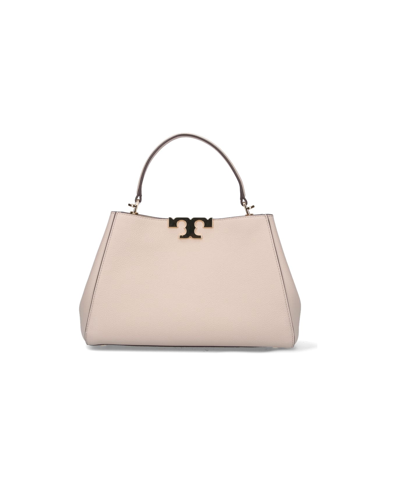Tory Burch medium Eleanor bag in cream hammered leather with top handle, adjustable and removable shoulder strap, magnetic closure with gold metal logo detail, interior pocket, and two main inner compartments.