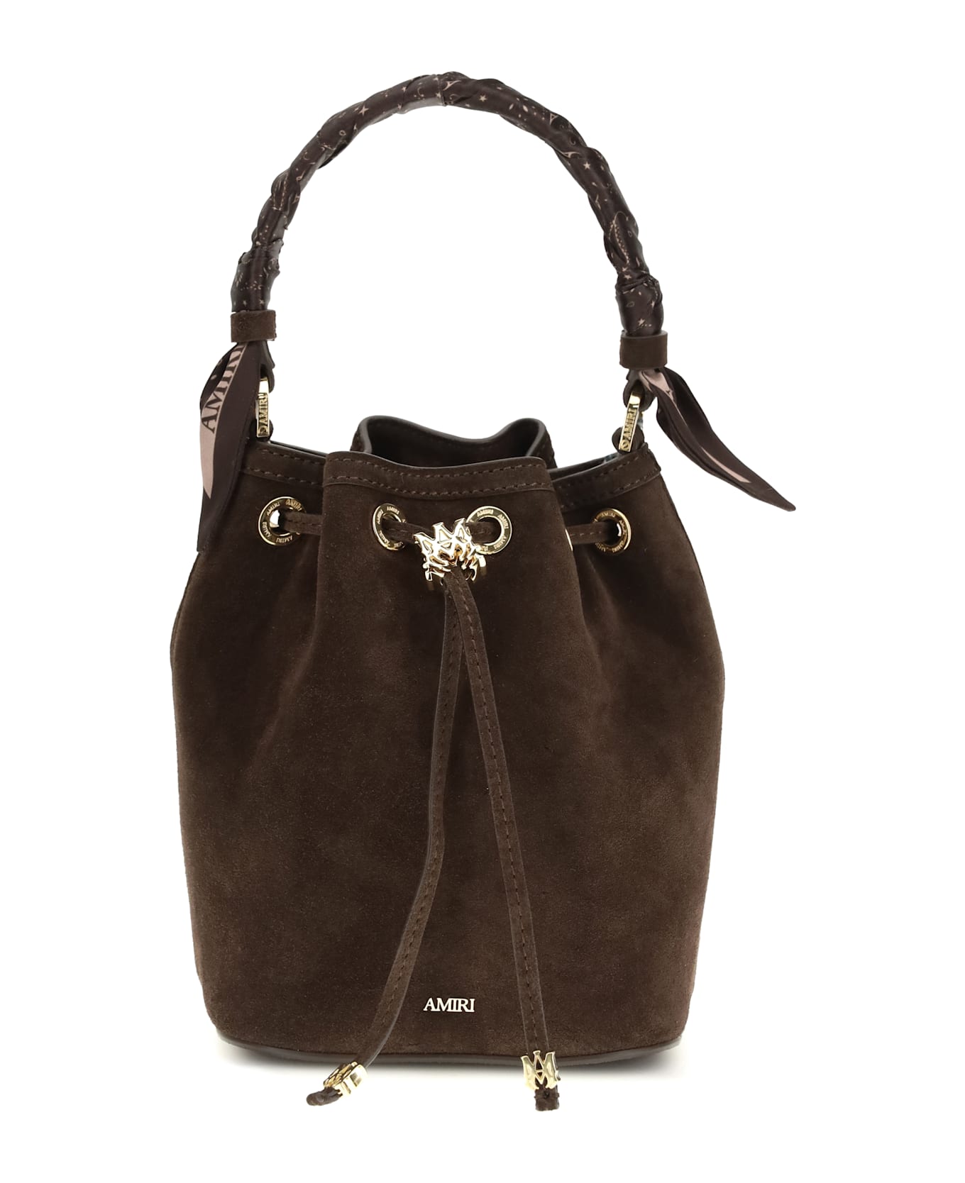 The micro ma bucket bag by amiri expresses timeless elegance through a compact and refined silhouette. made of soft suede leather, it is embellished with custom ma metal details that enhance its exclusive character. the drawstring closure ensures practicality, while the top handle with knotted paisley scarves adds a distinctive touch. a detachable suede shoulder strap completes the design for a versatile and sophisticated style.