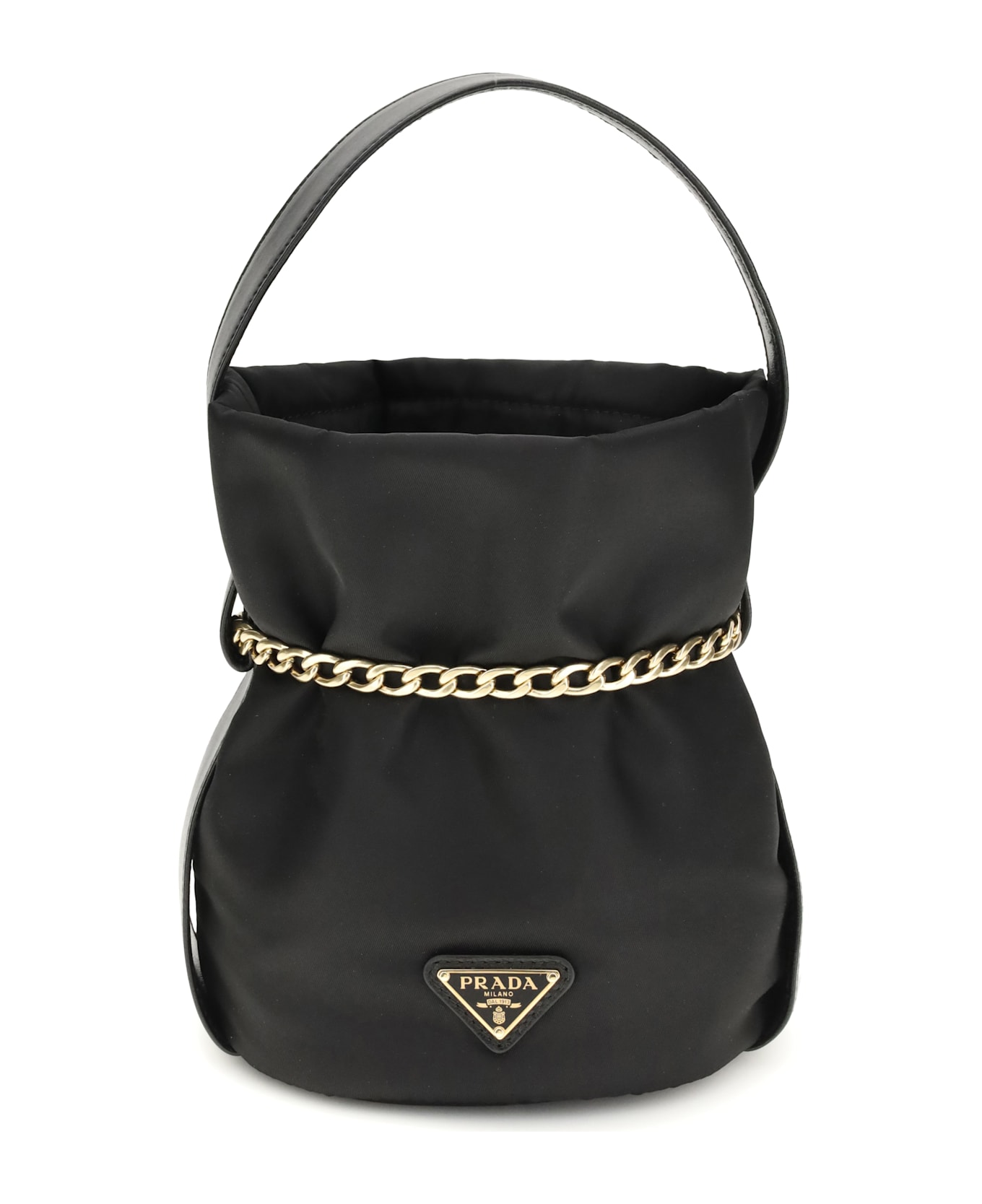 The petit sac noir is a mini bucket bag by prada with a soft, modern silhouette crafted from re-nylon, prada s innovative material produced from recycled and purified ocean-collected plastics. it features a functional external pocket and the signature enameled triangle logo on the back. designed for versatility, it can be carried by hand or worn crossbody thanks to its nappa leather handle and saffiano leather shoulder strap. lightly padded and finished with metal hardware, the bag closes with a chain fastening and is fully lined in re-nylon.