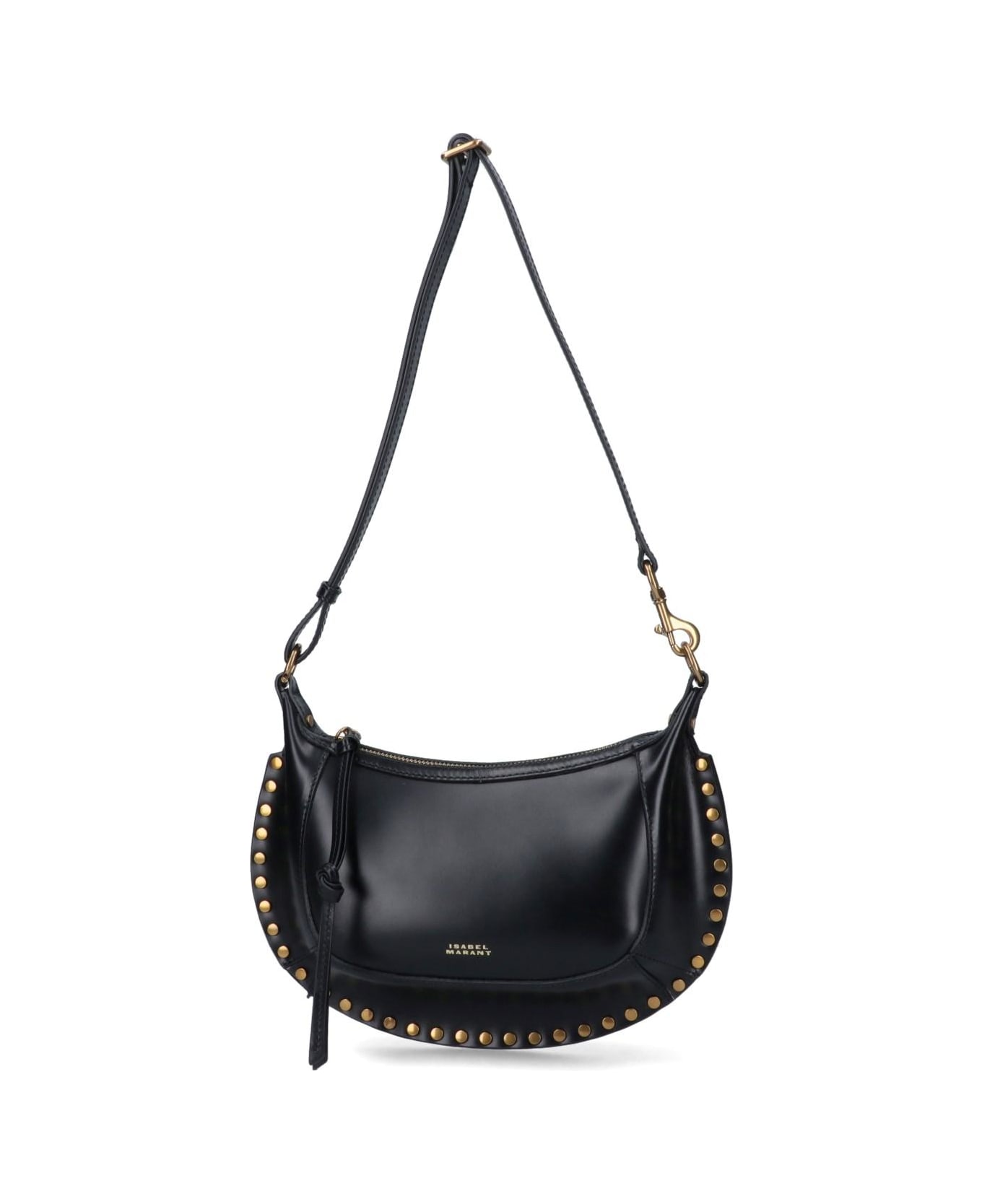 Isabel Marant 'Oskan Moon' black leather shoulder bag with adjustable removable shoulder strap, top zip closure, gold logo print on the front, gold stud appliqu at the front and back, two inner compartments, an inner zip pocket.