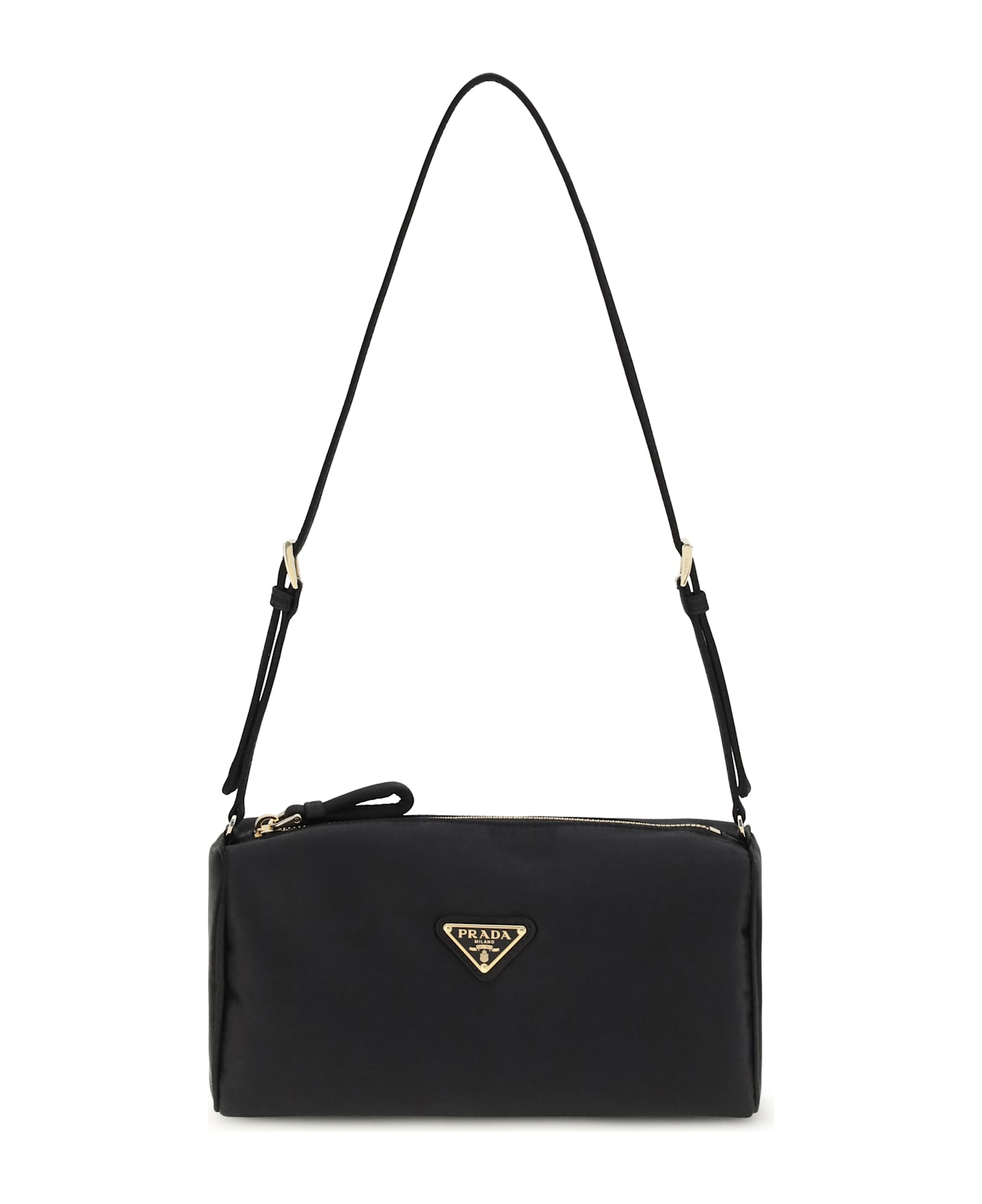 The satin shoulder bag by prada is an elegant and sophisticated accessory, characterized by a silhouette with essential geometries. featuring a top zip closure, it has an enameled metal triangle logo on the front, an adjustable shoulder strap with strap, and gold-tone metal hardware. the design is completed by a practical internal zip pocket, ideal for combining style and functionality in a single iconic piece.