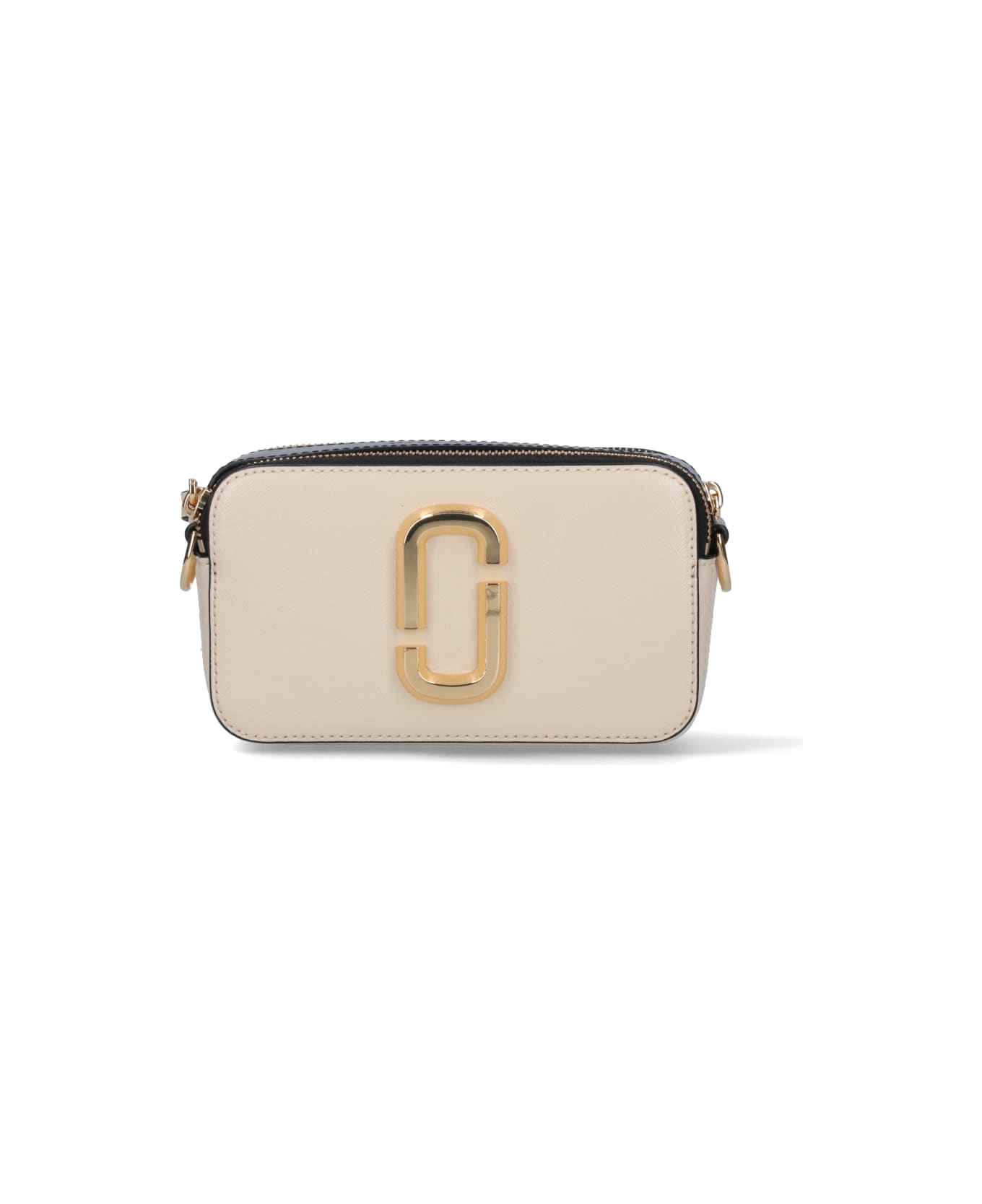 Marc Jacobs 'The Snapshot' crossbody bag in cream leather with black details, double zip closure, adjustable and removable shoulder strap in logo fabric, gold metal logo charm on the front, back slip pocket, inner slip pocket, two main inner compartments.
