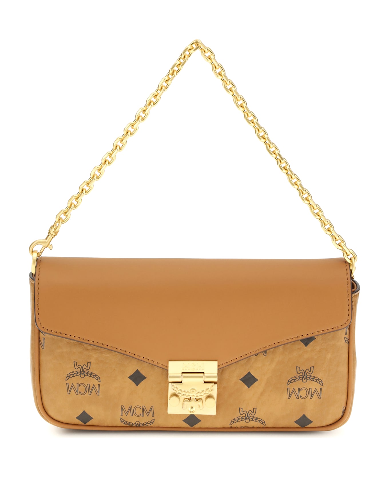 The tracy mini shoulder bag by mcm is made of canvas lined with smooth leather inserts and features the iconic all over visetos print. equipped with an adjustable and removable metal chain and leather shoulder strap, it features an interlocking stud closure, while the suede-effect interior is completed with a zippered pocket and two credit card slots, combining practicality and elegance in a compact size.